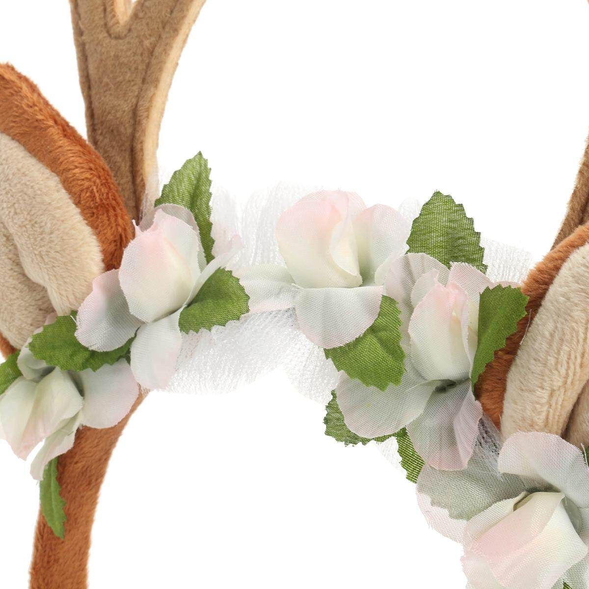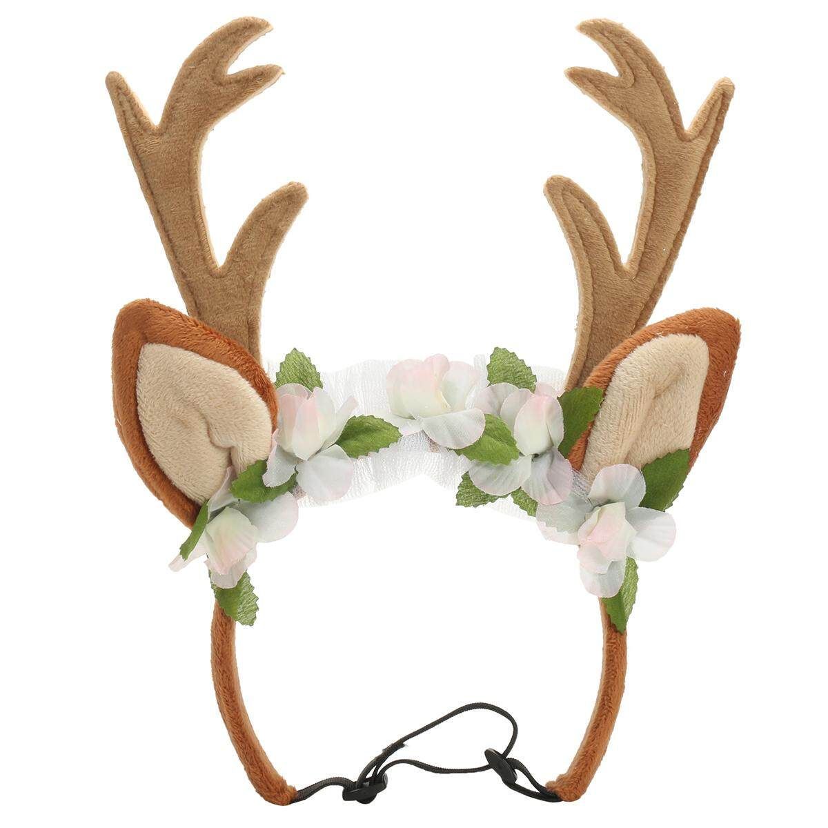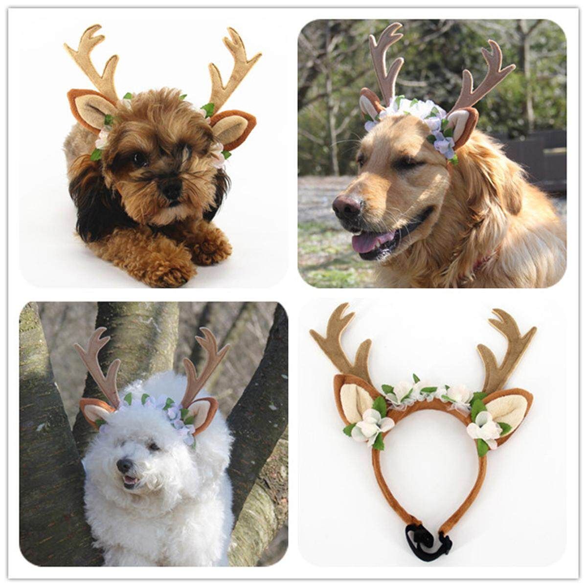 Features: Adjustable flexible pet headband with ears for dogs cats fancy dress. - Design with adjustable buckle and elastic bungee, suitable for pets of varying sizes. The antlers contain iron wire, can recover easily after warp with broken off. -The small hat is made from nice materials. It is and comfortable for your pet. - Adorned with delicate flowers, elegant and fairy-tale style. the reindeer headband cn make your pets more attractive. - Perfect for Christmas, Halloween, birthday, and festivals.