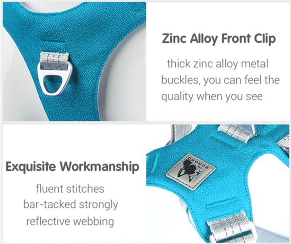 Two-leash attachment points: Aluminium alloy D ring on the harness's back, and Stainless steel O-ring on the harness's front.