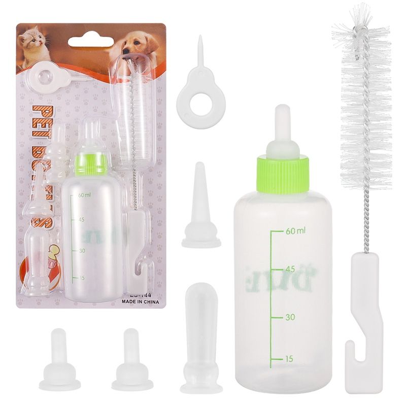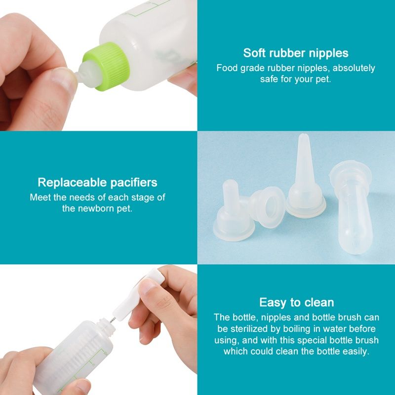 Reliable material: the nipple is made of silicone, odourless and reliable, the suction bottle made of plastic and the brush handle made of stainless steel and the bristle is made of plastic, the nipple without holes, you need to make small openings and let the water drip or drip dry4 sizes of pacifiers: the cat infant bottle set has 4 different types of pacifiers that can be used and replaced. You can choose a different size for your pet's mouth, which is suitable for puppies, kittens or other small animals such as hamsters, chinchillas. Squirrels, rabbits, etcYou can immediately administer medications to your pet and also serve as a feeding aid for puppies who have not yet started eatingEASY TO CLEAN - The pet nursing bottle set has a brush which is good for cleaning the bottle. After washing, dry the bottle with a towel or in the air. The dummy is easy to replace and provides your pet with a comfortable feeding tool