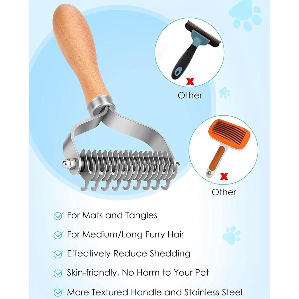 [Friendly to Your Pets]Compared with other similar dog grooming brushes, like slicker brush or deshedding tool, our product with sharp but rounded teeth, can easily remove mats, tangles, loose hair, shedding fur from even the thickest undercoats without irritation, also perfect for cats and dogs with sensitive skin.