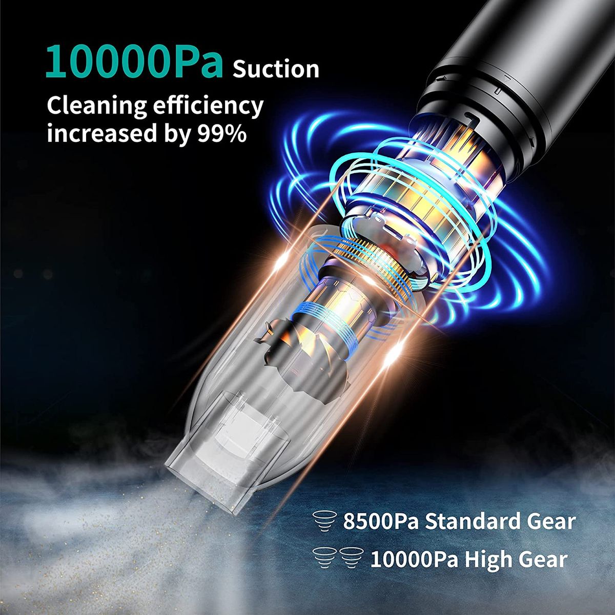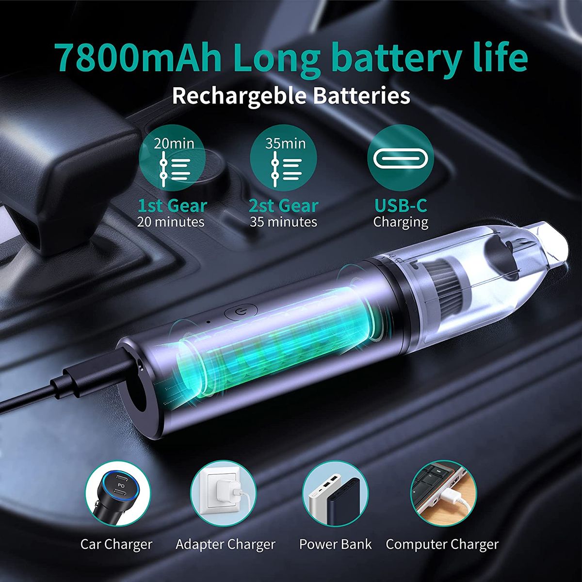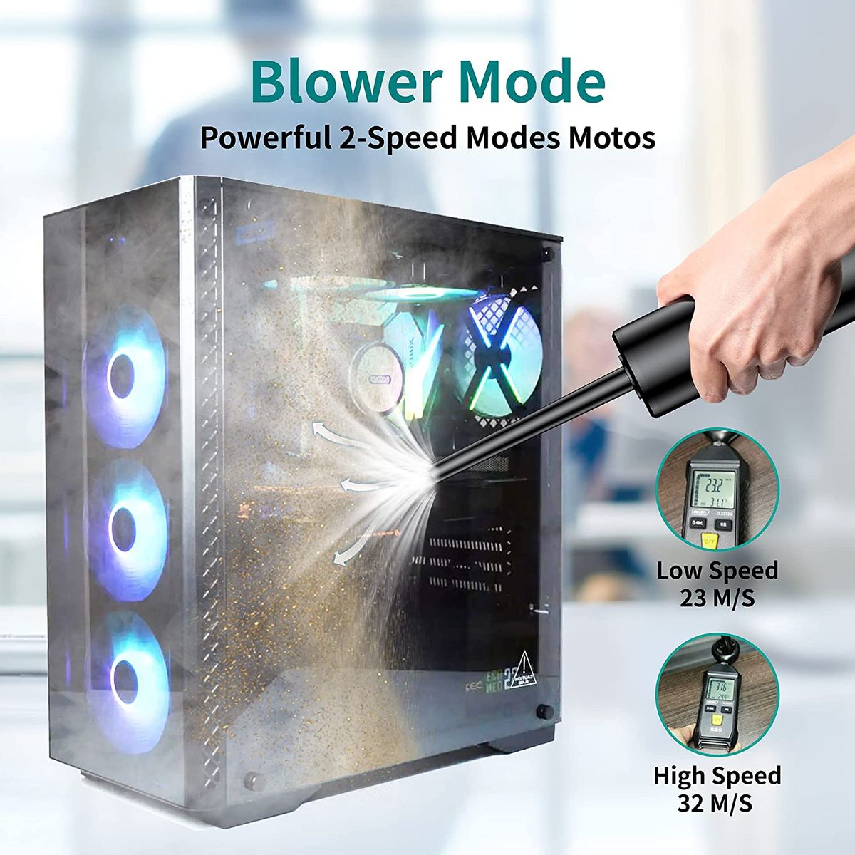 air duster is equipped with an upgraded 60000 RPM high-efficiency motor, with blowing force is up to 1.9-2.5OZ, which provides super airflow for deep cleaning and dust from any electronic device. Long press switch for 3 seconds can switch the device on & off. Short press switch can switch to 2 Gear wind speed ( High Speed: 500L/Mins, Low Speed: 300L/Mins) for different equipment cleaning, so that dust has nowhere to stay.【LED Lights & Cordless Compact Design】This air blower has a LED light irradiation-point, LED lights automatically illuminate when turned on cordless air duster, allowing you to easily clean up dark corners, bringing great convenience to your cleaning. With its ergonomic shape and cordless design, air duster for computer is small, lightweight, comfortable to hold, and space saving, convenient to carry around.【Chargeable Battery and Fast Charging】Keyboard cleaner can be charged and used repeatedly. The computer air duster has a built-in 8000mAh battery, which can run continuously for 20-30 minutes. The car duster comes with a Type-C cord fast charging cable (adapter not included), which can be charged by computer, or mobile power supply. Compressed air dusters battery protection design, Do not charge when the machine just finished using, the battery temperature is too high, please wait 10 minutes to cool down before charging.【Multiple Application Scenarios】The rechargeable air duster comes with 4 nozzles, and 2 brushes for multi-scene cleaning, which meets different needs. The thin and long nozzle makes it easier to clean dust from anywhere you want: computers, keyboards, cars, fans, air conditioners, etc electrical and electronic equipment; household cleaning of lily windows, sofa, corner crevices, etc. The multifunctional nozzle is used to inflate swimming rings, yoga balls, air mattresses, beach toys, etc. Use the brush to better clean the dust.