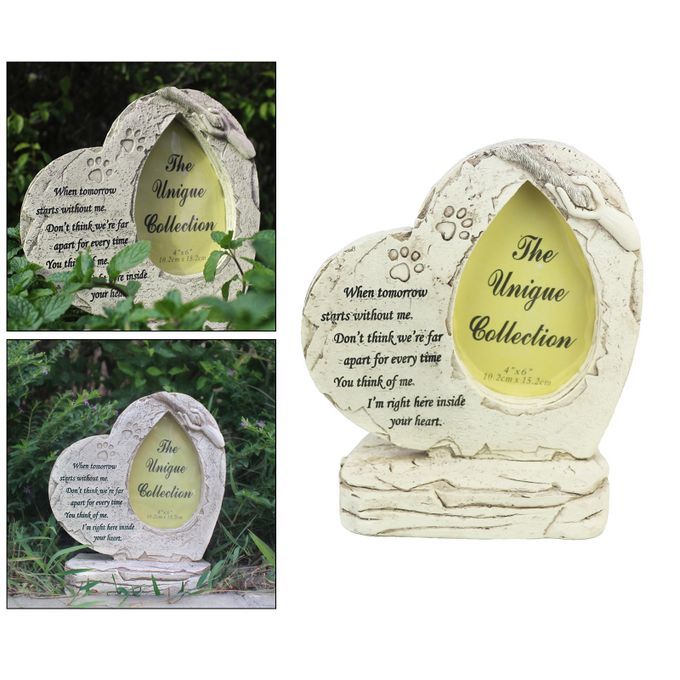 Made of high quality resin material,the appearance is lifelike,weather-resistant,waterproof and sun-proof,suitable for outdoor use.Perfect design: The pet memorial stone is heart-shaped,engraved with a photo frame,paw prints and sympathy poems.Without deliberate sculpting,it gives people a natural and primitive atmosphere.Put this unique pet garden stone in the driveway,under your favorite tree, to the flowerbed,or on the porch or patio.It can express your sincere emotions and helps a sad friend or loved one remember their pets.