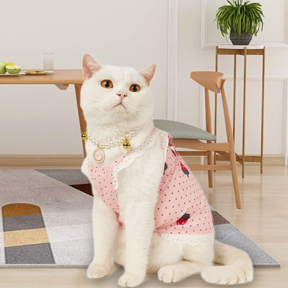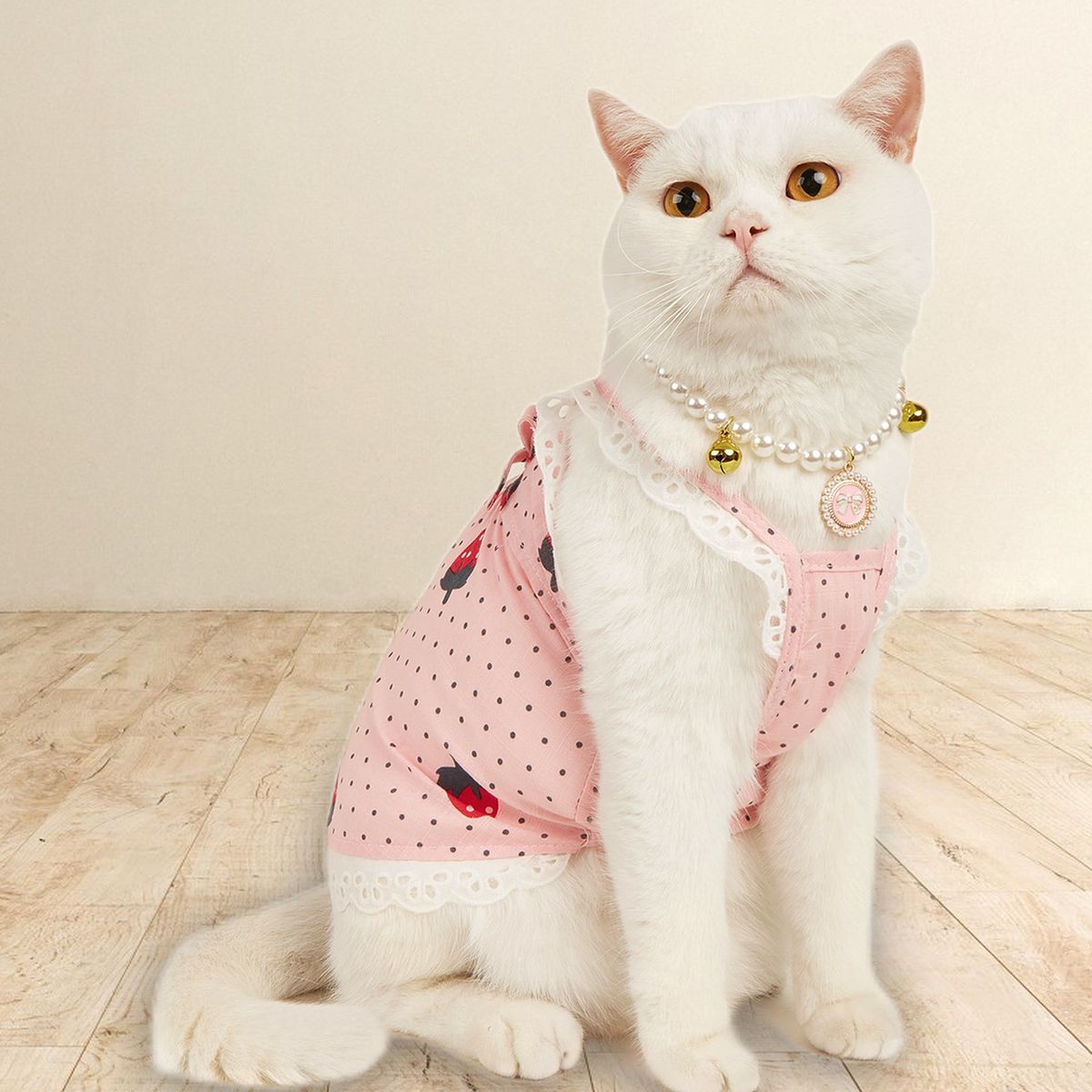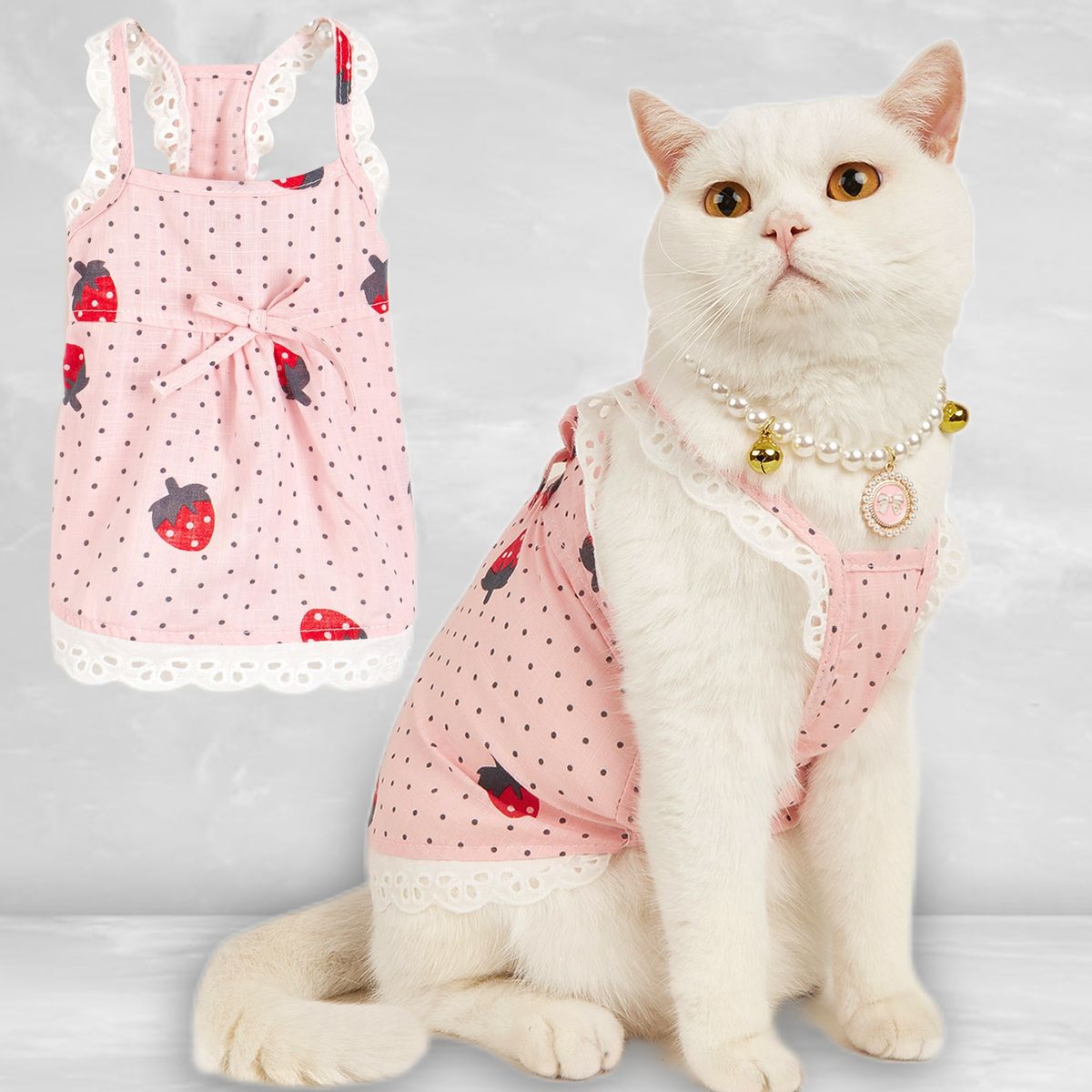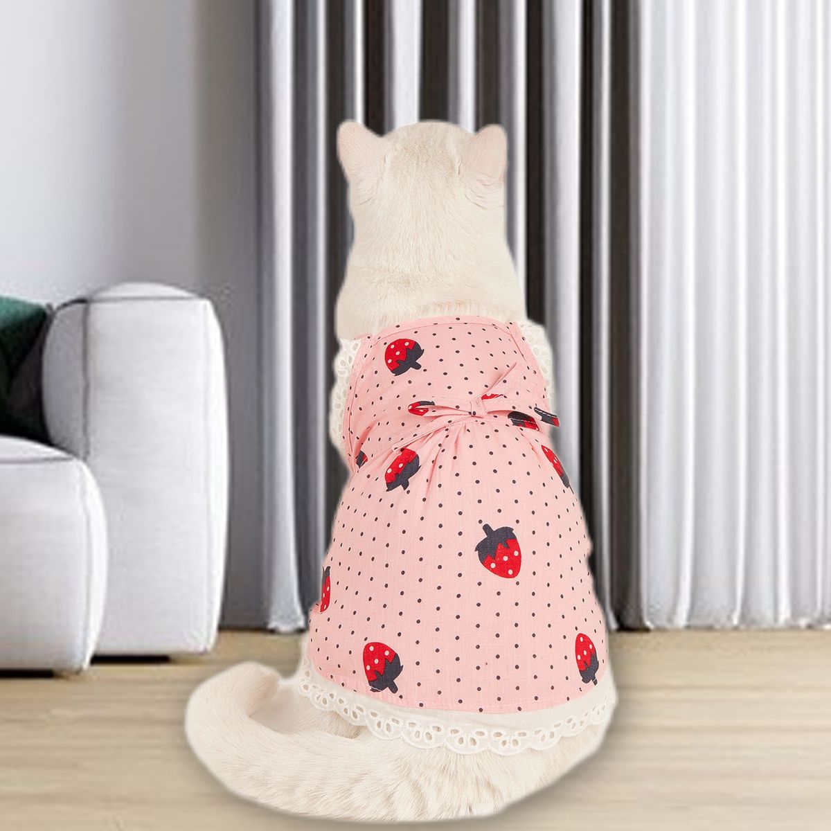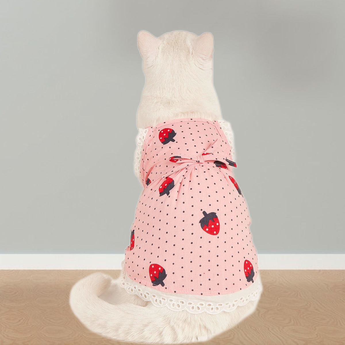 Definitely that this dress with stylish loose sling design and strawberry print design make the dog look more elegant and attractive. Soft and elastic pleated hemming, the dog does not feel tight when wearing it.