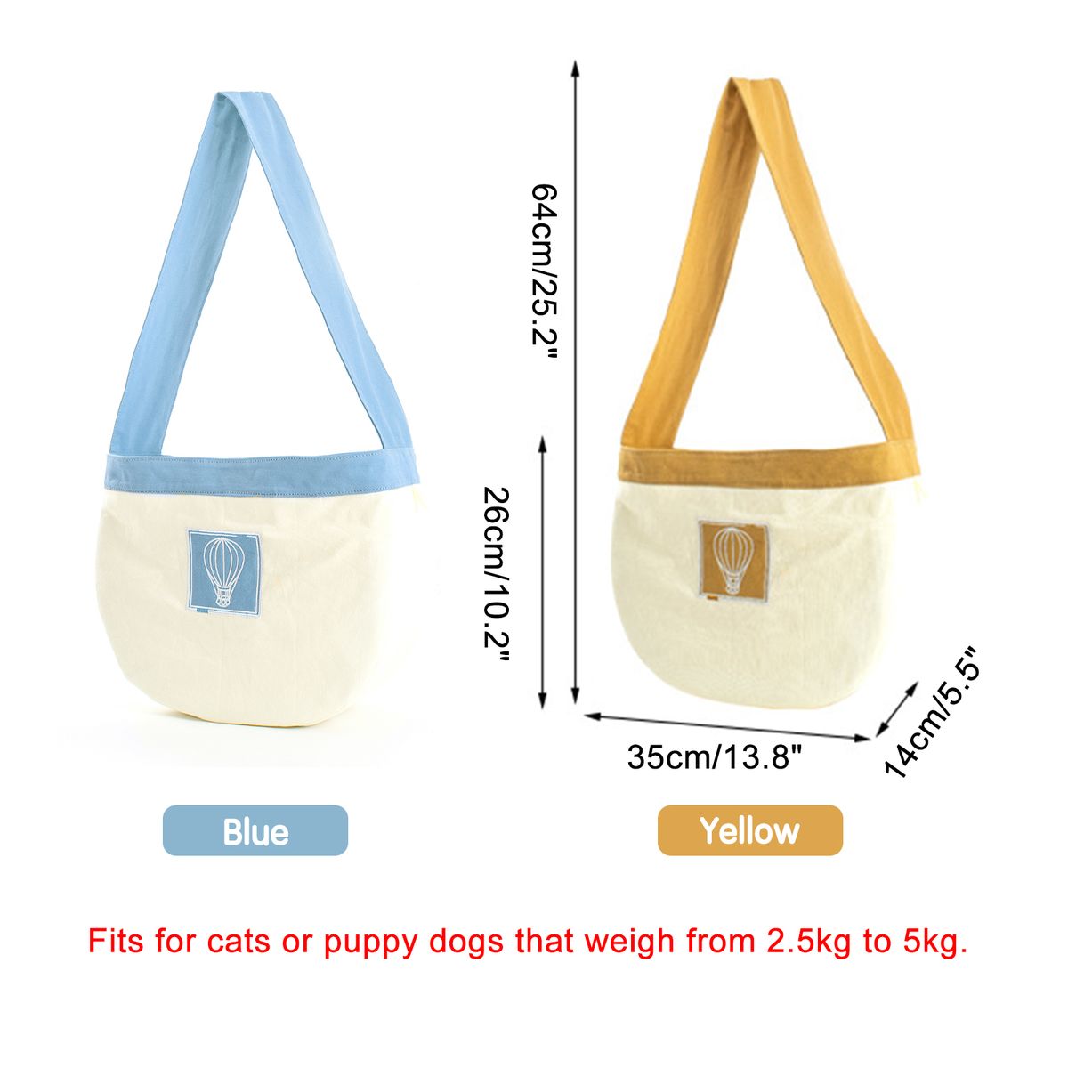 13.8 quot; X 10.2 quot; X 5.5 quot; sling bag for carrying a cat or small dog. This hands-free shoulder bag in canvas fabric is breathable, lightweight, and washable. It has widened shoulder strap for more comfortable carrying. A safety belt with a clip can be attached to the cat collar for safer walking. Have it for the next adventure with your pet.