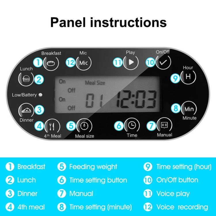 6. Automatic feeding: 4 meals per day (upper limit), 20 servings per meal (upper limit), about 10g per serving