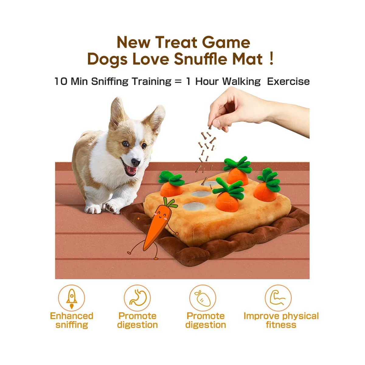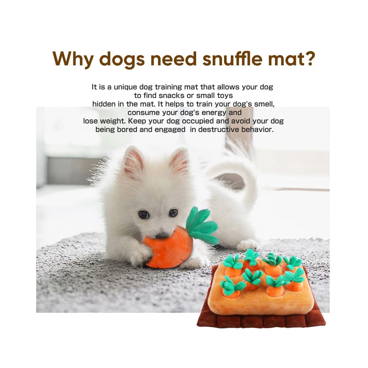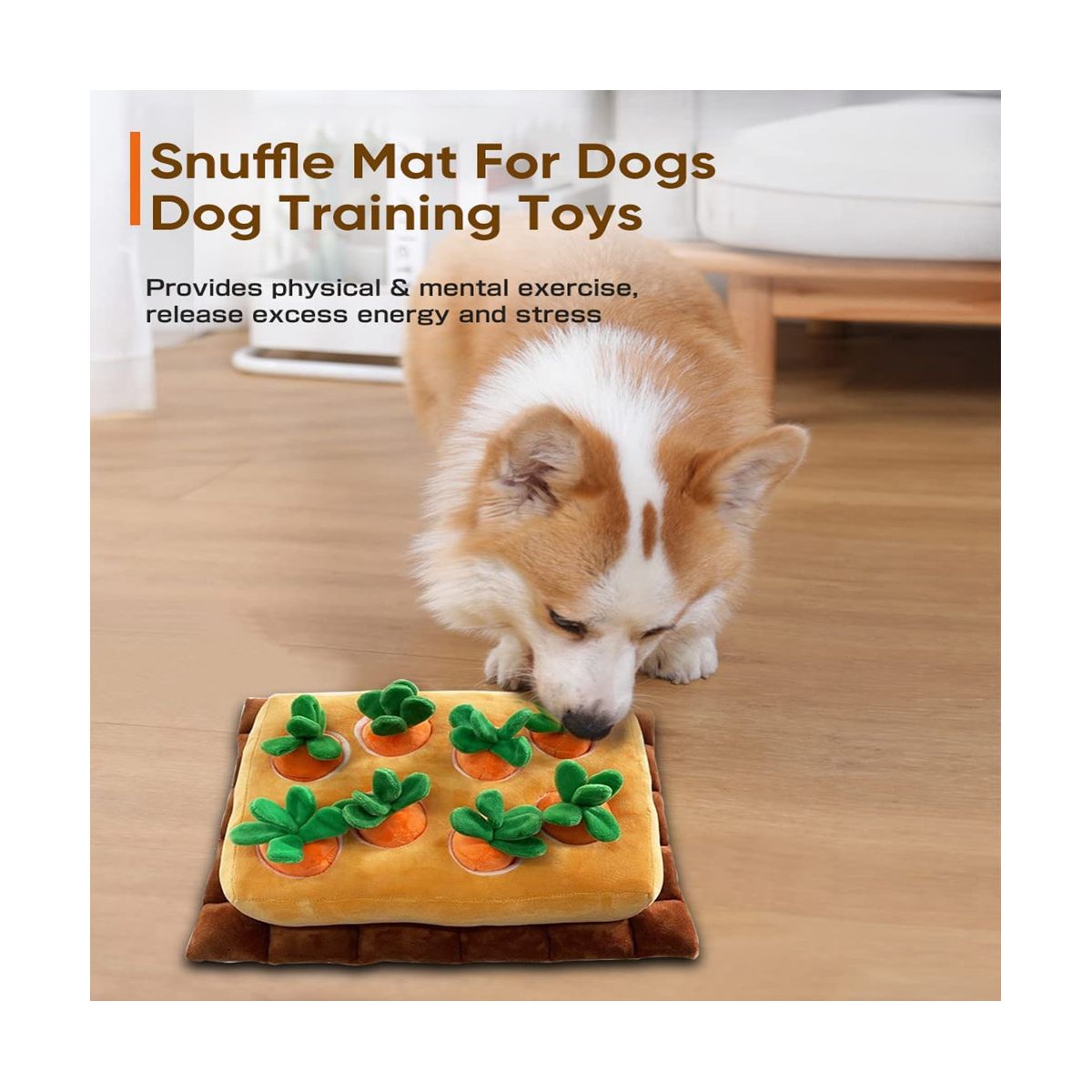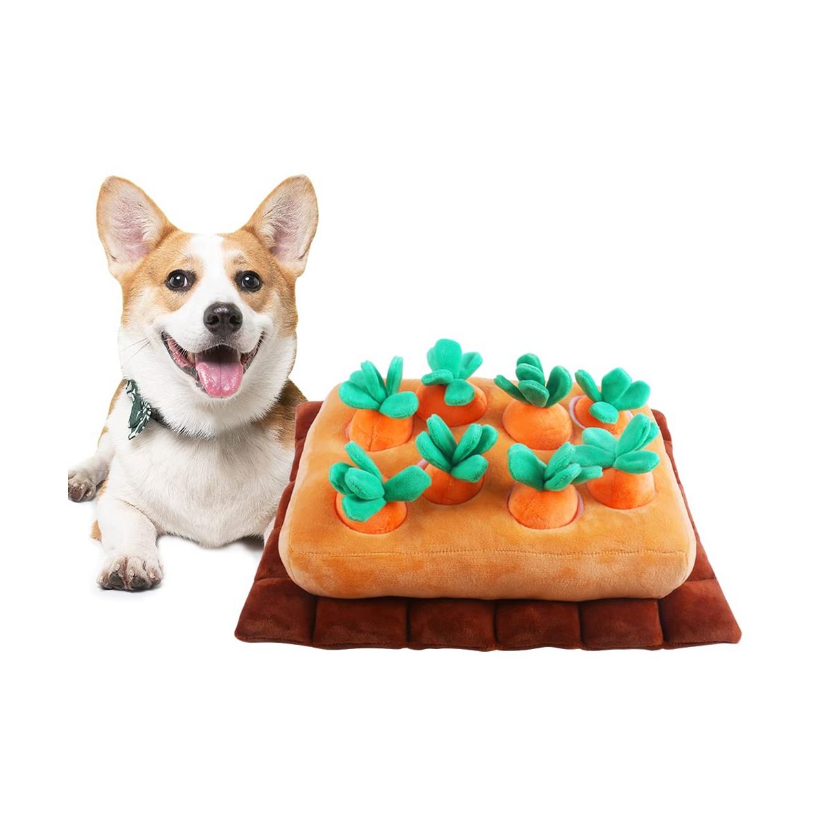 Dog's loves carrot snuffle mat:when had a lot of rain and he needed something to keep entertained when couldn't go out to play.sporadically put treats under a few of the carrots and he happily tosses about and plays fetch with when he's done sniffing out the treats.