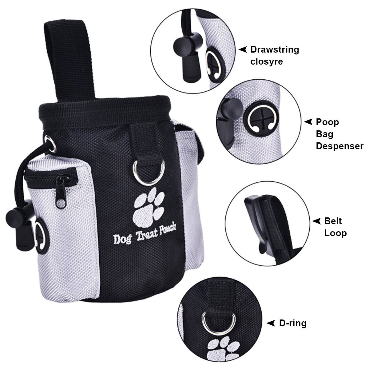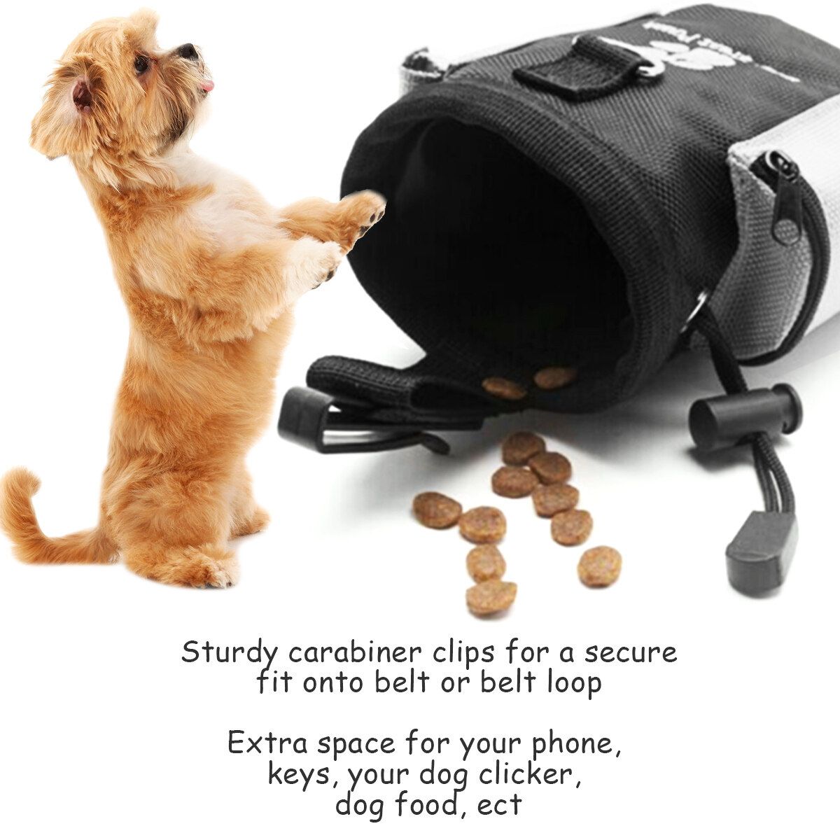 Features:: Black + GreyMaterial: PolyesterSize: Approx.10 x 6 x 14cm/3.94 x 2.36 x 5.51''This 2 in 1 activity snack bag is made from durable polyester, which is easy to wipe cleanA sturdy ring insert makes taking out snacks quick and easy, and is easy to close thanks to a drawstringThe bag features a clip and a loop for attaching to belt, and also has an extra pocket with fasteningD-ring for attaching a dog or clicker
