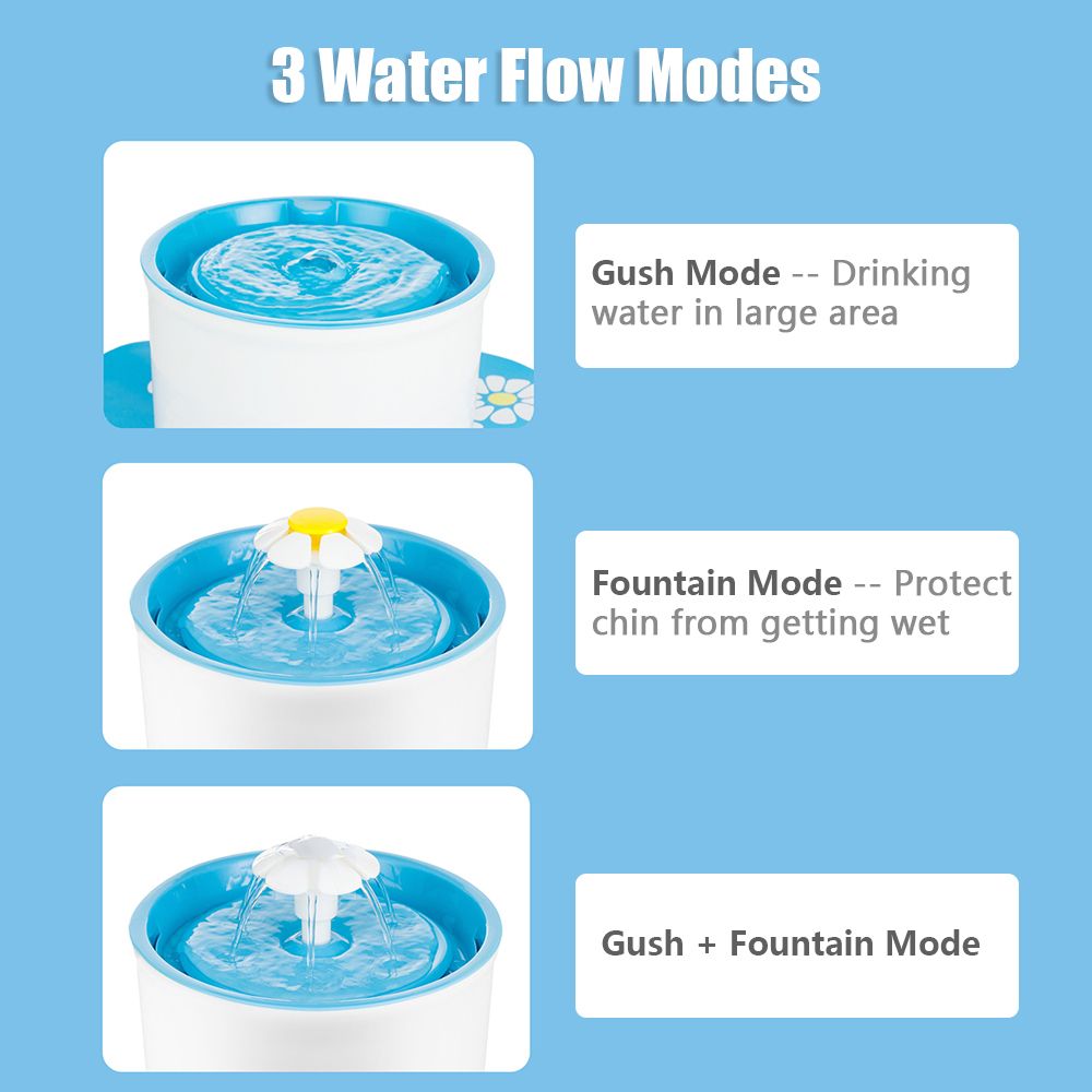 Automatic pet water fountain with 3 water flow modes is designed for cats and small dogs to use. With deep purification, it can provide you pet with healthy, fresh and oxygen-enriched water.