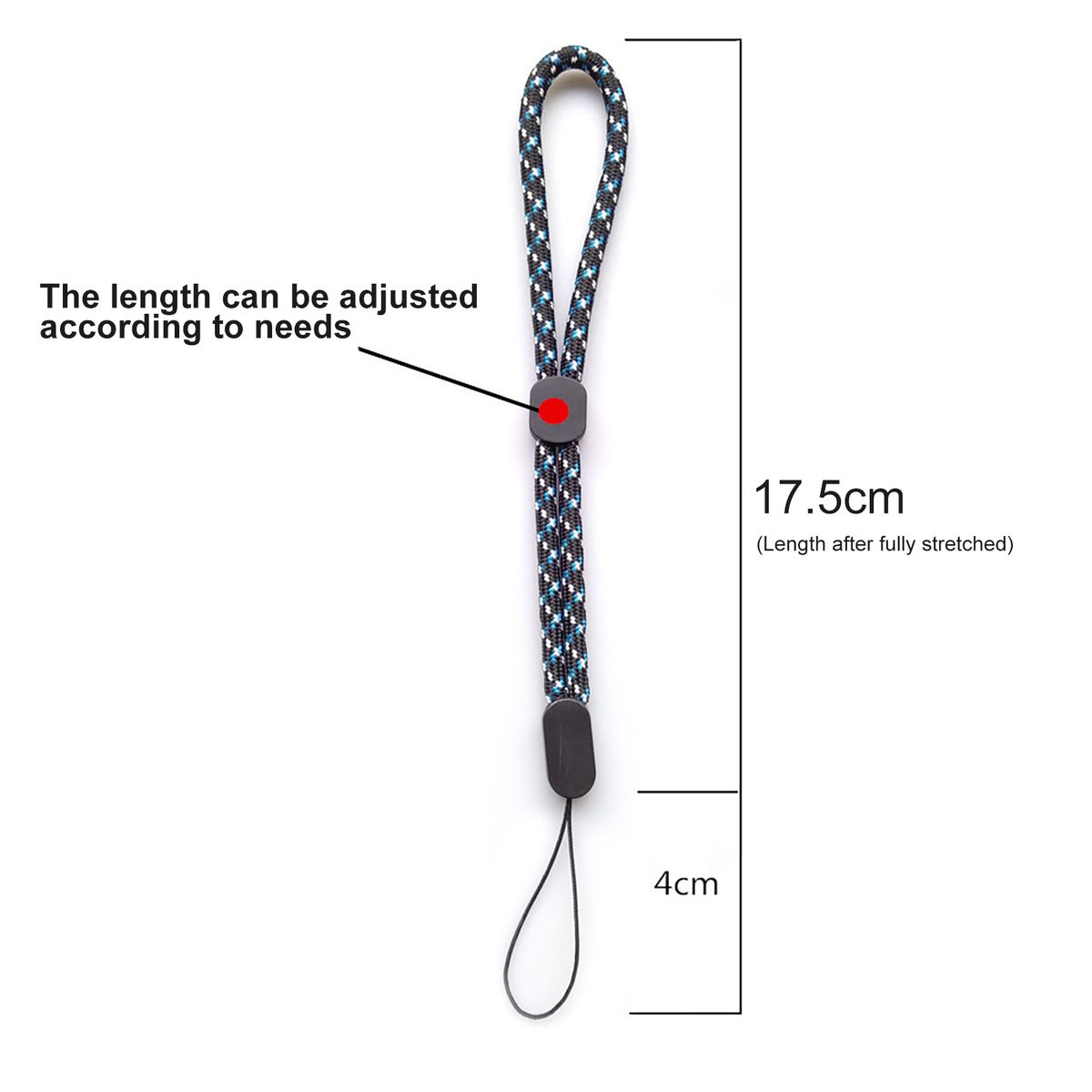 The length of the phone lanyard is 17.5cm, width is 0.5cm and thickness is 0.5cm. The extended length is 17.5+4cm.