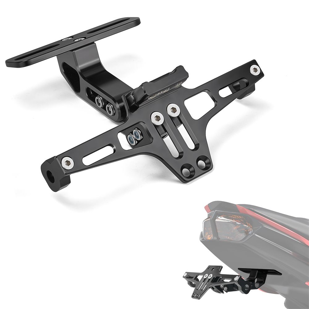 【THREE ADJUSTABLE FUNCTIONS】 - Motorcycle License Plate Bracket can adjust the horizontal angle different from the ground for getting the best view of road legal. Universal fender eliminator with length adjusts function help to avoid scratching the exhaust or rear seat. The installation position of the license plate can be moved up and down, choose a suitable installation position to fit the different sizes of license plate.Features: