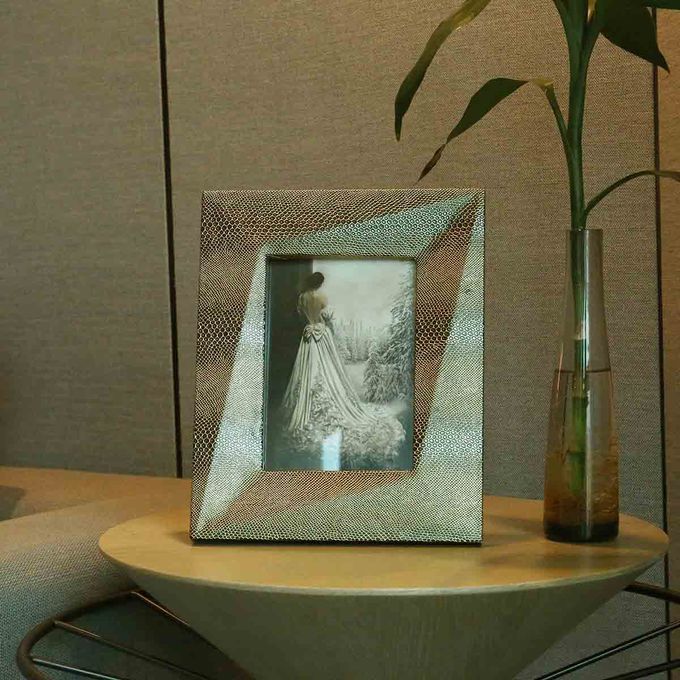 This is a delicate photo frame with a clear snakeskin texture. On the surface, there are geometrical patterns in postmodernism.