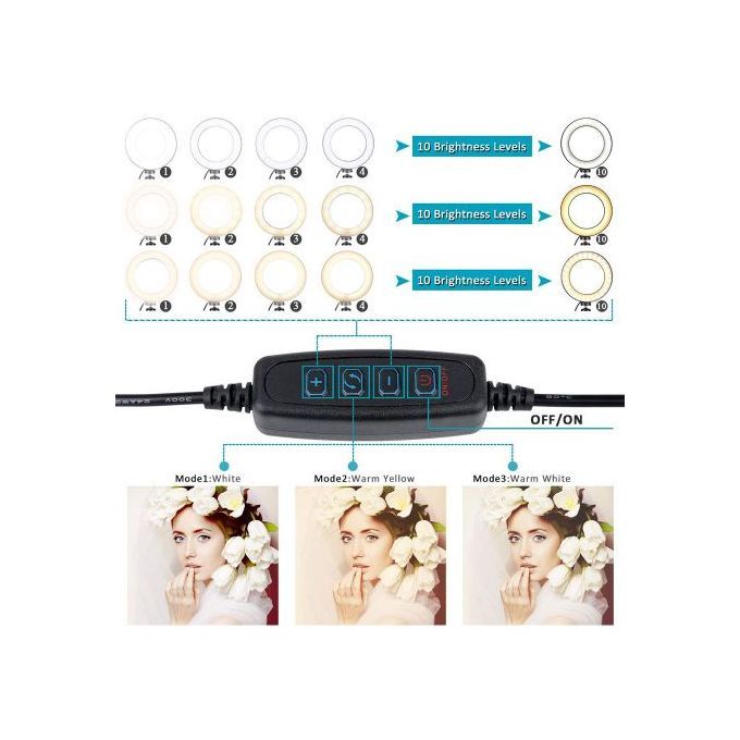 【Dimmable Ring Light】3 colors lighting mode: white, warm yellow, and warm white. Each lighting mode has 10 adjustable brightness to choose from, meet all your needs in different circumstances. It is the perfect dimmable daytime lighting to take away all the unflattering shadows!【Adjustable Tripod Stand】Extendable from 50 cm to 160 cm, just lock it at desired length for your preferred use, you can stand it on your table or on the floor for your convenience.【Multi-Functions】2-in-1 design combines the phone holder and selfie ring light together, it is a professional tool for creating live videos/recording with smartphone or computer. Perfect extra light for make-up, live streaming, lay flat, selfie photos, filming, video recording, online teaching, dark scenery vlogging etc.【Universal Phone Holder】Compatible with almost ALL smartphones with or without a case, suitable for iPhone X/7 Plus, 7, 8, 8 Plus, X, 6, 6s, 5, 5s, 4, 4s/Samsung Note 8, S8/S9/LG/HTC. 360 degree rotatable, adjustable viewing whether it may be horizontal, vertical, or any angle under the sun.[USB CABLED]Works with most devices that support USB port, like laptop, PC, USB charger, AC adapter, and etc. Easy control on cord to power on/off or switch to the lighting mode you preferLight Source: LEDShape: RingTotal Power: 14WColor Temperature: 2700k to 6500KLight mode: White light, Soft light, Warm lightDimmable: YESDimming range: 10%-100%Total illumination: 3600LM CRI (Color Rendering Index): >90Adapter: Universal USBMakeup, Live Stream, YouTube Video, Beauty Selfie etc.About the Tripod StandMax Heigh: 145cm(Black)Min Heigh: 38cm(Black)Max Tube: 16mmSegments: 5Material: Aluminum+PC
