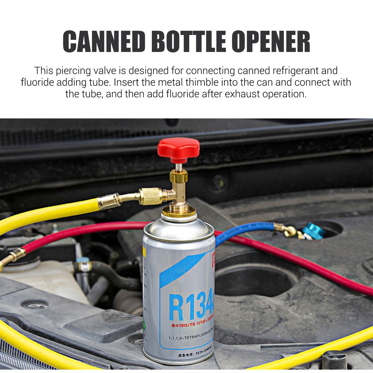 Designed for connecting canned refrigerant and fluoride adding tube. Insert the metal thimble into the can and connect with the tube, and then add fluoride after exhaust operation.