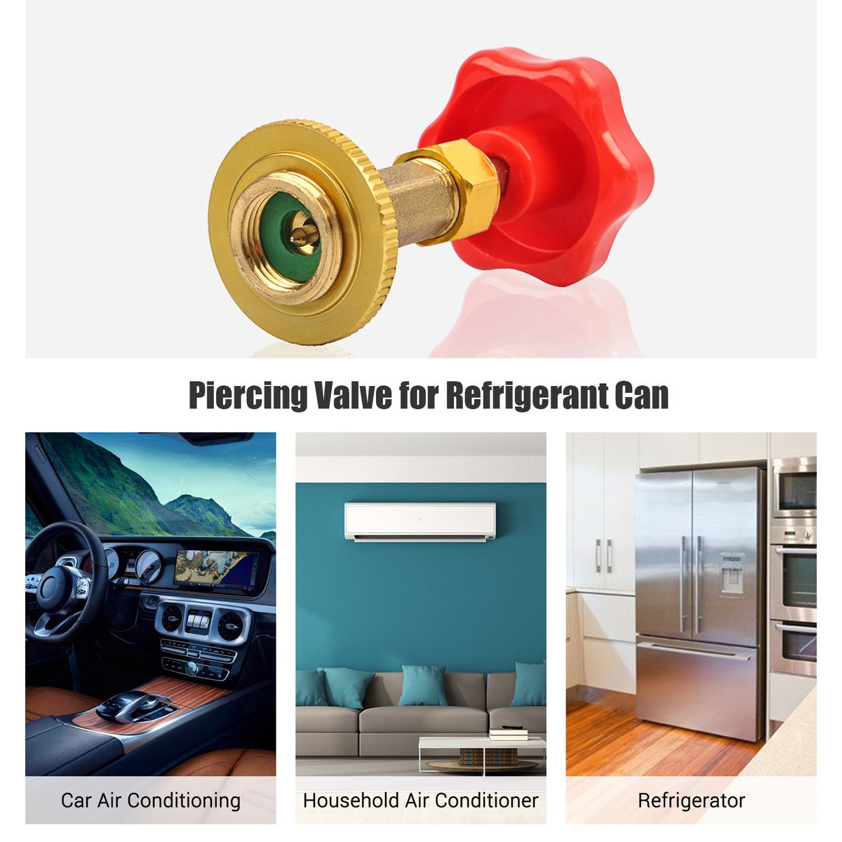 Silver: suitable for most small cans of refrigerant. Red: suitable for R134A. Green: suitable for R12/ R22/ R410/ R600a. The valve can be used in car air conditioning, household air conditioner, refrigerator, etc.