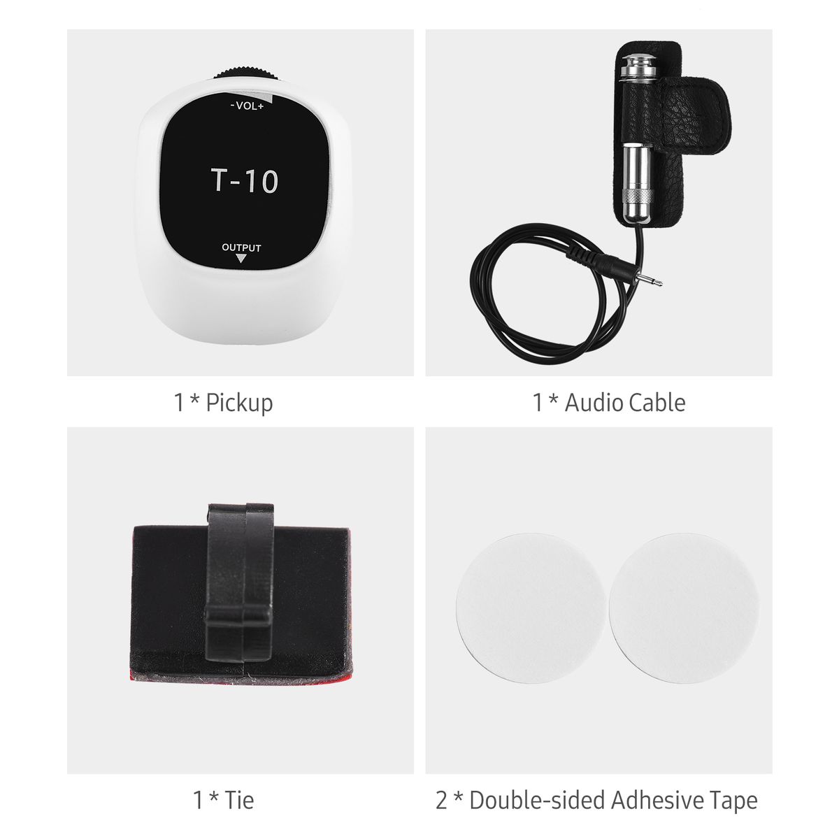 1 x Pickup,1 x Audio Cable,1 x Tie,2 x Double-sided Adhesive Tape