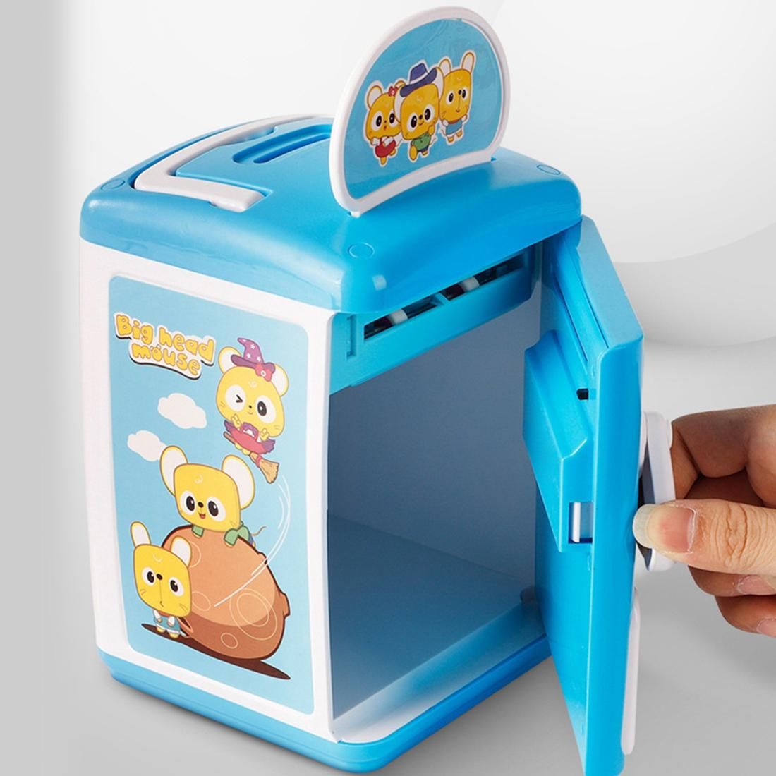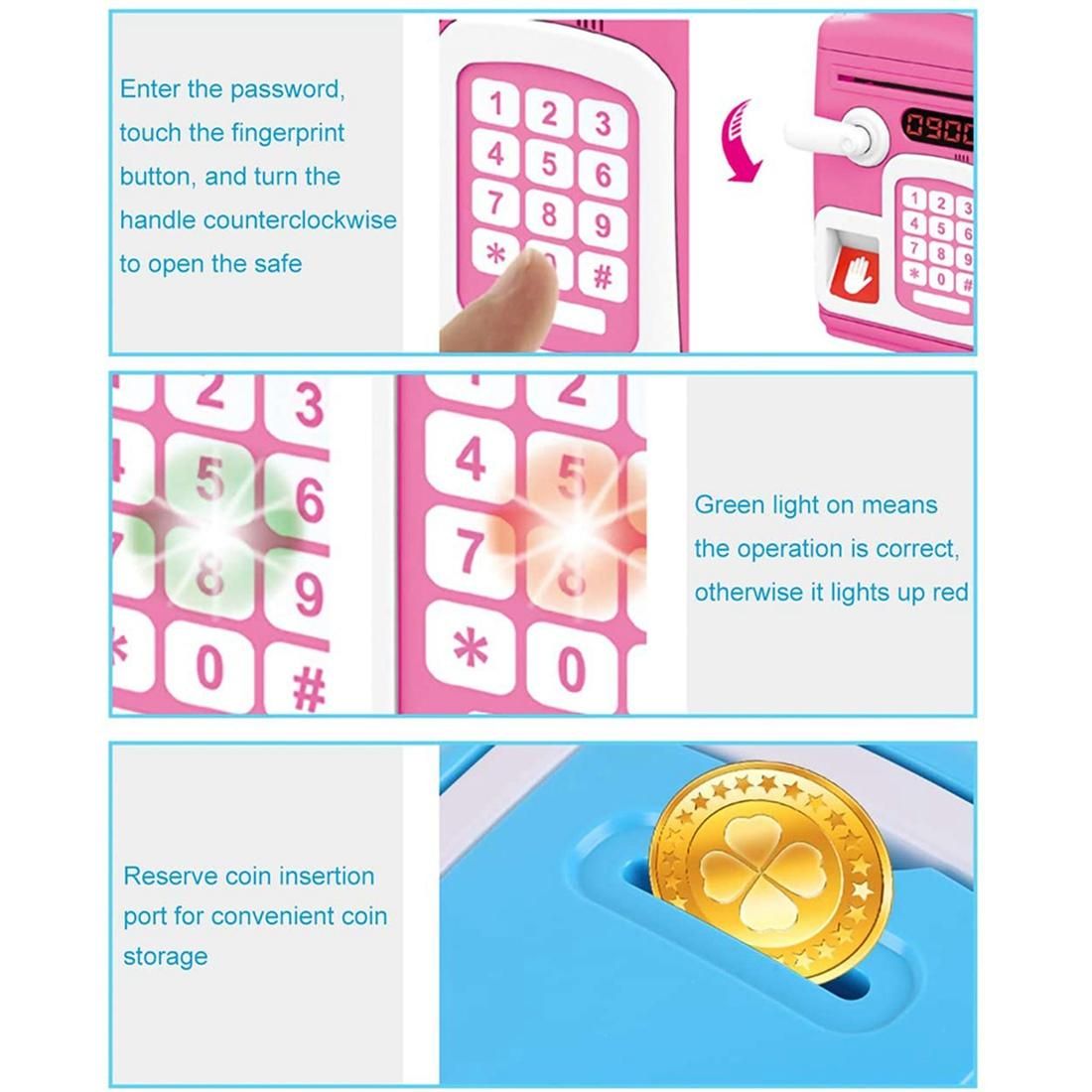 [Digital Password & Pretend Fingerprint Lock]Double security, it requires a 3-digit password and Fingerprint to open the piggy bank (Default password is 000), and children can also set their own favorite password. 4 nice ringtones automatically loop when saving money, Increase the joy of saving. The fingerprint is needed to confirm to open it. It's a pretend fingerprint but acts like a real one.Applicable batteries: 3 * AA batteries (not included).