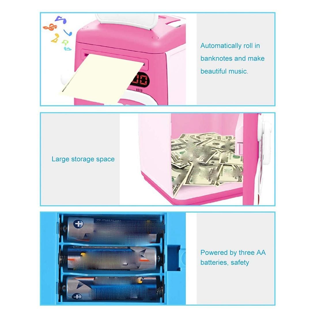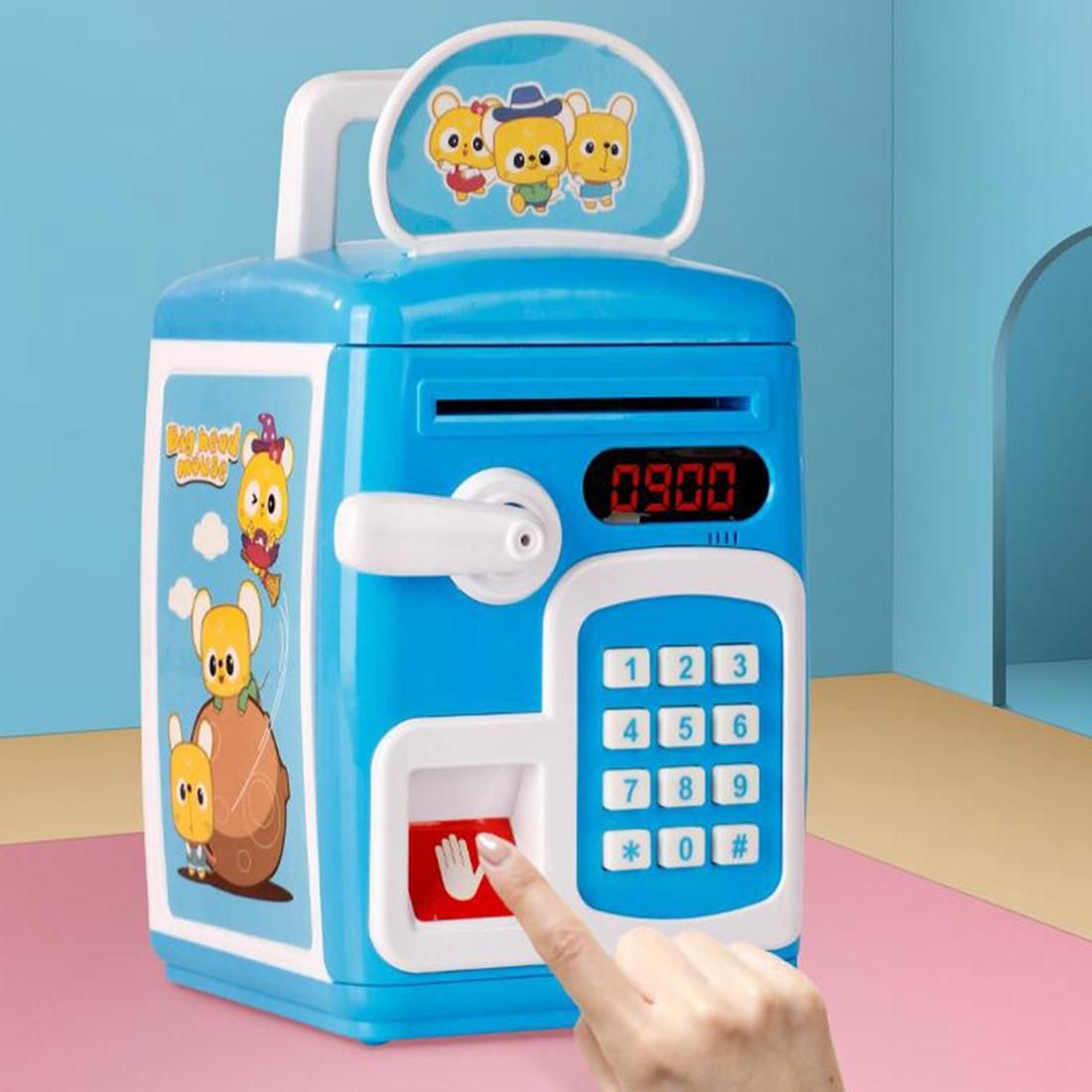 Piggy Bank Toy for Kid,Simulate Fingerprint/Electronic[Digital Password & Pretend Fingerprint Lock]Double security, it requires a 3-digit password and Fingerprint to open the piggy bank (Default password is 000), and children can also set their own favorite password. 4 nice ringtones automatically loop when saving money, Increase the joy of saving. The fingerprint is needed to confirm to open it. It's a pretend fingerprint but acts like a real one.Applicable batteries: 3 * AA batteries (not included).