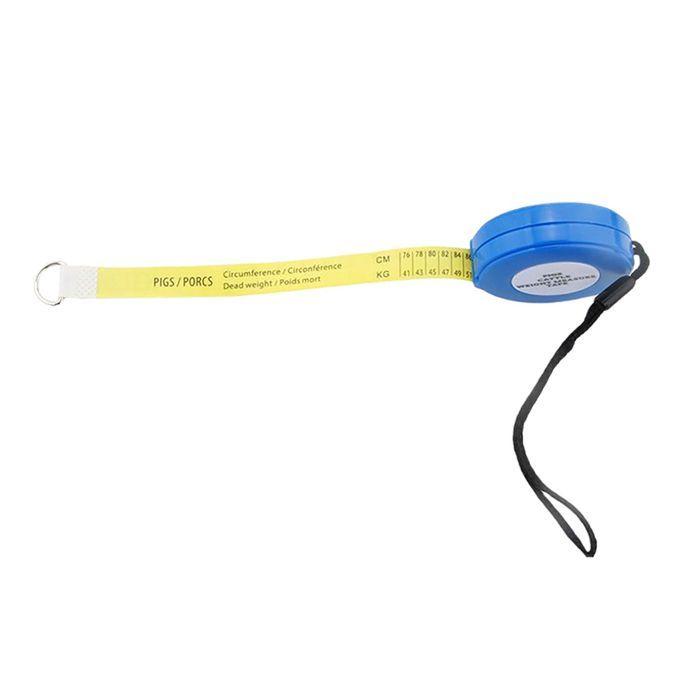 Estimate body weight by measuring (pig, beef, dairy) bust. At the push of a button, the tape retracts automatically, very convenient