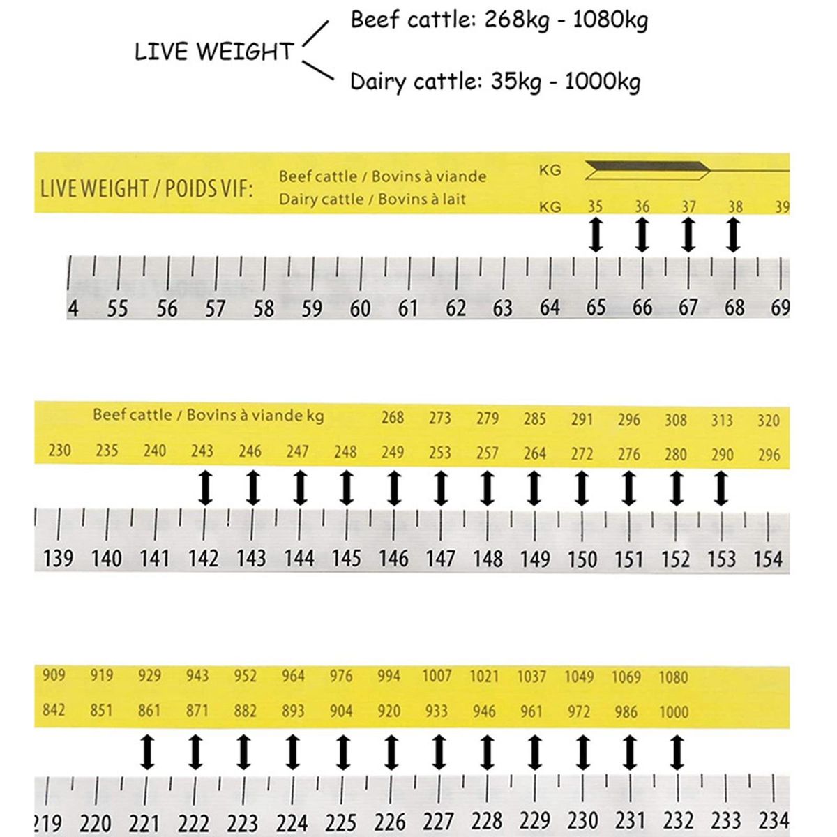 Material: ABS shell + fiberglass tape, measurable range: 268kg to 1080kg for beef cow, 35kg to 1000kg for dairy cowEstimate body weight by measuring (pig, beef, dairy) bust. At the push of a button, the tape retracts automatically, very convenientLength 250cm/98.43inch, tear-proof and waterproof, one side is the length, the back is the weightThere are two tables on the other side of the tape: one is the weight corresponding to the of beef cow, and the other is the corresponding weight of the of dairy cowsLanguages: English and French. Portable handle lanyard for easy portability