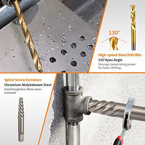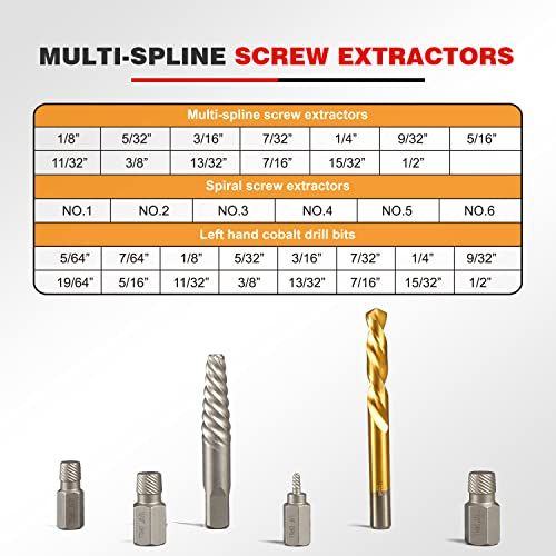 - Speial Left Hand Design Dill Bit:Creates extra gripping power Unique design for use with srew extrators to remove broken Removes broken studs, bolts, soket srews, and fittings.Inlude 5/64",7/64",1/8",5/32",3/16",7/32",1/4",9/32",19/64",5/16",11/32",3/8",13/32",7/16",15/32",1/2".