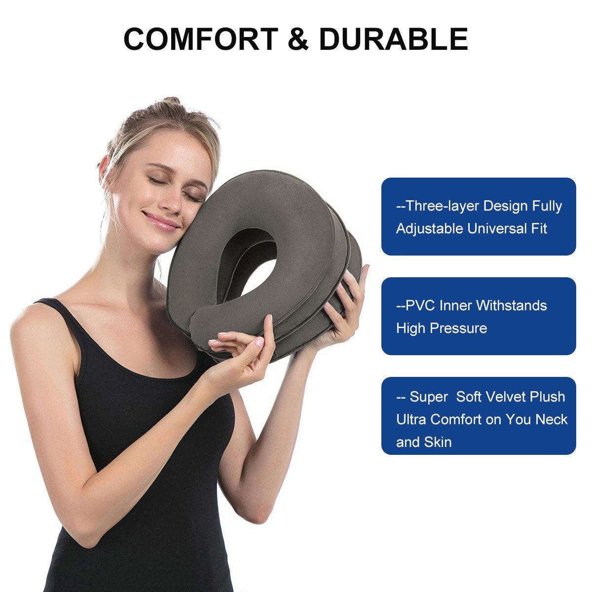Comfort amp; Durable -- Three-layer inflation system with PVC inner withstands high pressure so no risk of bursting through over-inflation. Premium quality breathable and super soft velvet plush, for maximum comfort on you neck and skin.