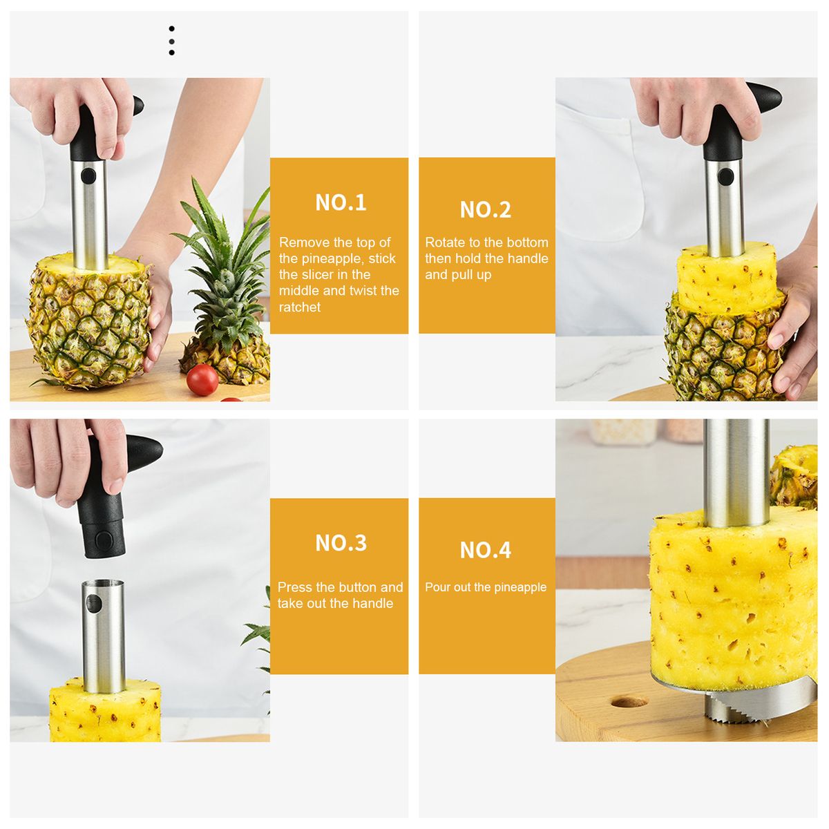 [Easy to Use]Remove the top of the pineapple, stick the slicer in the middle and twist the ratchet to get formed and ring-shaped pineapple flesh, and enjoy on the spot.