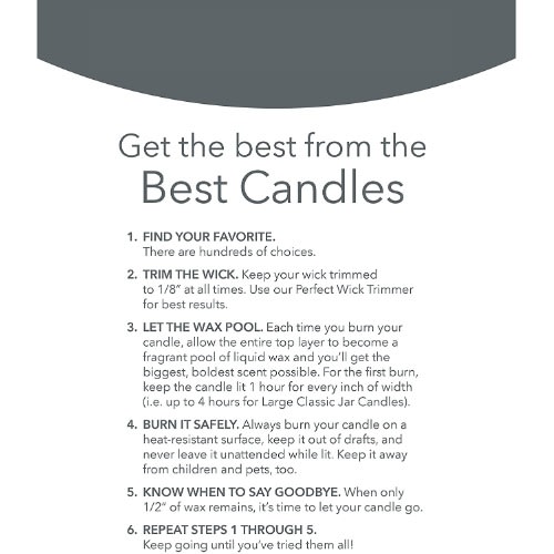 Our largest Jar Candle provides over 110 hours of soothing fragrance designed to create a welcoming home for family and friends. The iconic Jar shape is a symbol of our 50-year commitment to creating the world's finest candles. Each is made with premium-grade paraffin and the finest quality ingredients from around the world. And, we select the ideal natural-fiber wick for each fragrance to ensure the best possible burn.