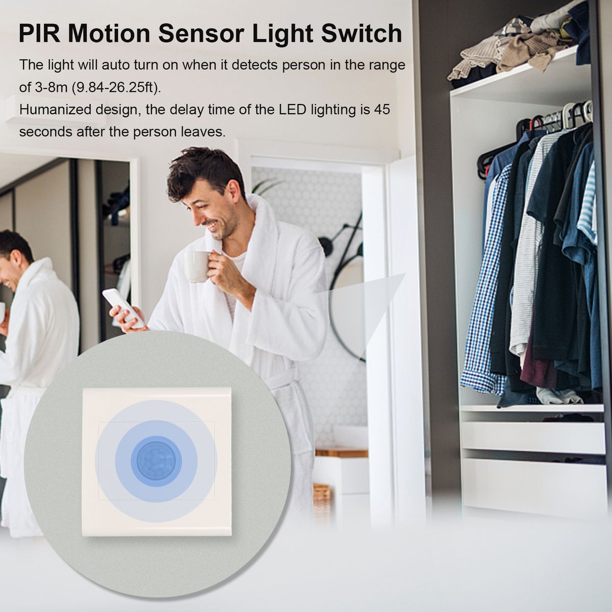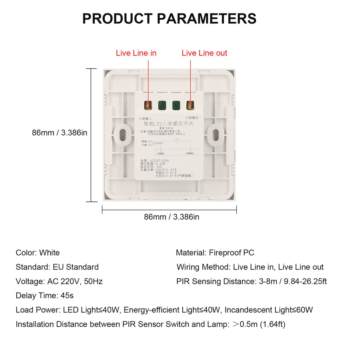 PIR motion sensor light switch is made of fireproof PC material, which will auto turn on the light when it detects person in the range of 3-8m (9.84-26.25ft). It fits well with smart life in your modern house. A must have in smart life!