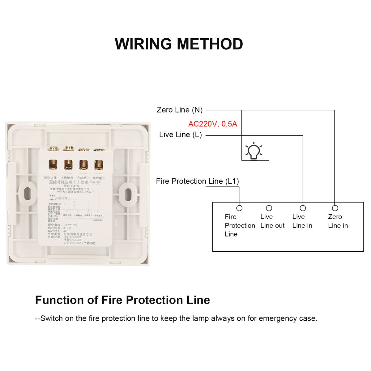 4 wiring terminals in the switch: fire protection line, live line in, live line out, zero line in. Switch on the fire protection line to keep the lamp always on for emergency case.