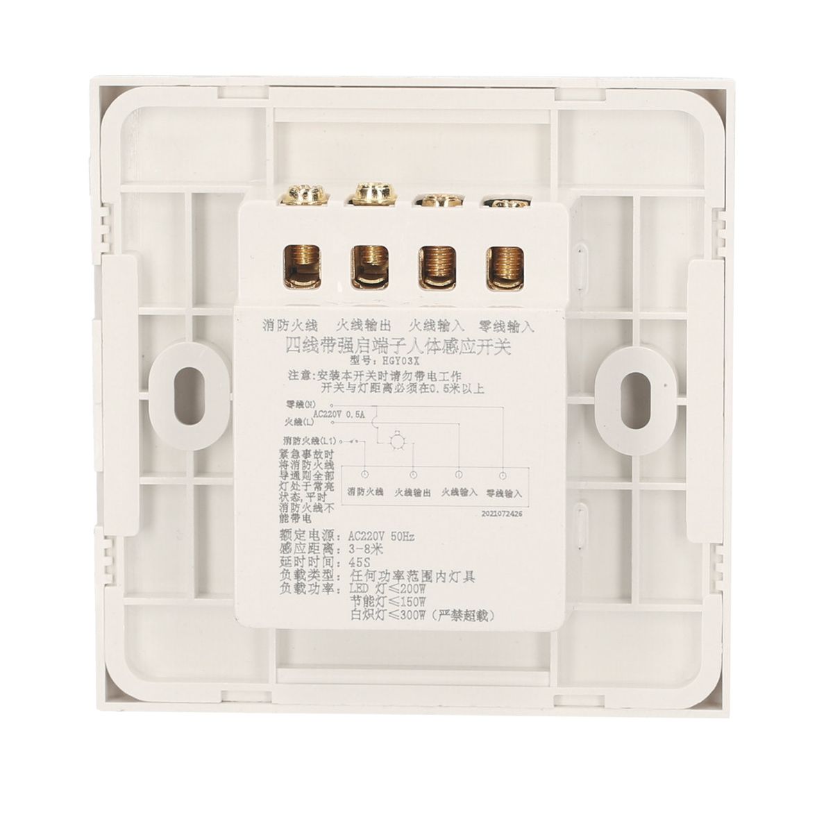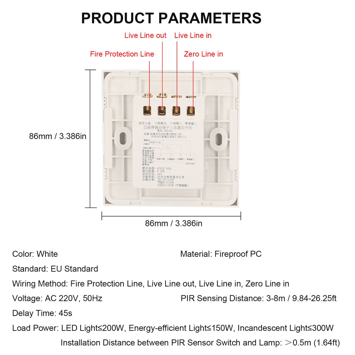 PIR motion sensor light switch is made of fireproof PC material, which will auto turn on the light when it detects person in the range of 3-8m (9.84-26.25ft). In addition, it features fire protection line to keep the lamp always on for emergency case. It fits well with smart life in your modern house. A must have in smart life!