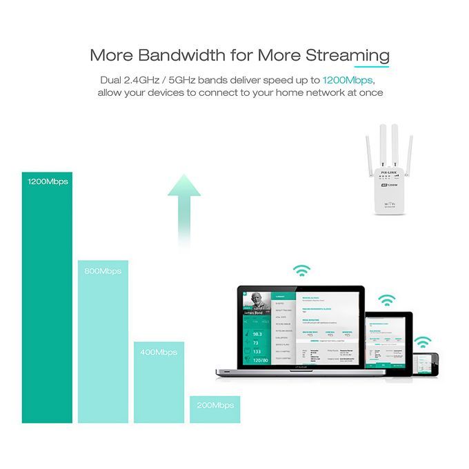 Supports 2.4G and 5G dual band, and 2.4G provides stronger penetration capability and is suitable for further transmission. 5G provides quicker transmission with less interference. Delivers speed up to 1200Mbps, allowing your devices to connect to your home network at once.