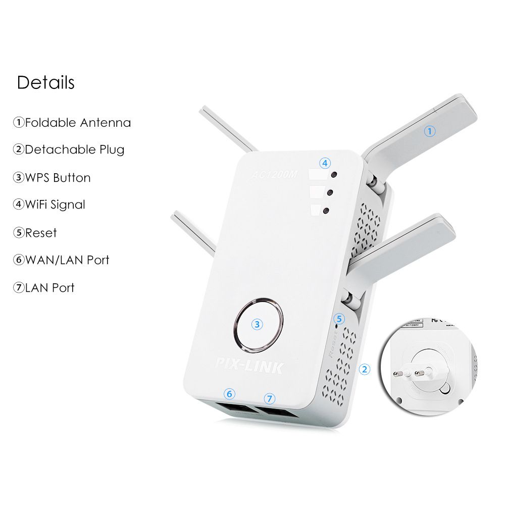 The following is the detailed introduction about our products: This Dual Band Repeater is mainly used for providing free WiFi service in big area such as factory, community, street or etc. Reset Button, One-key WPS Encryption