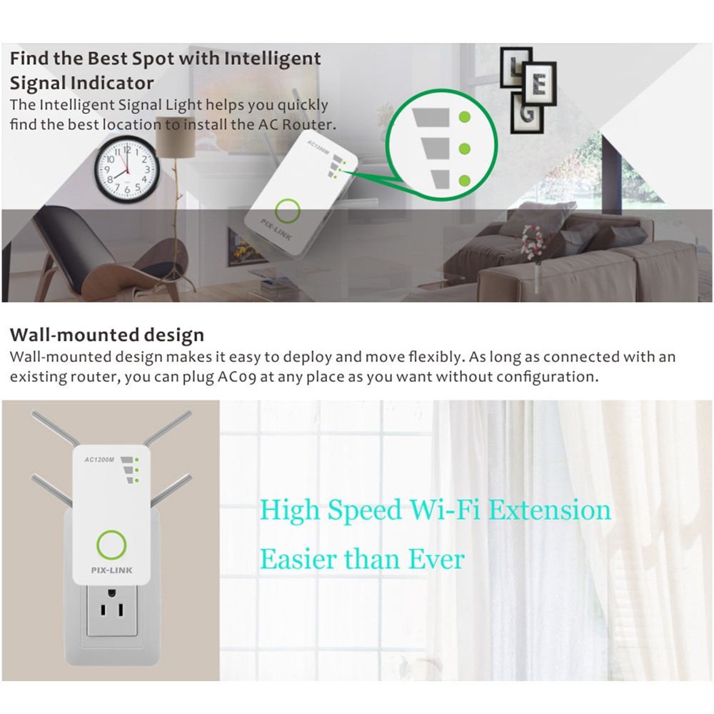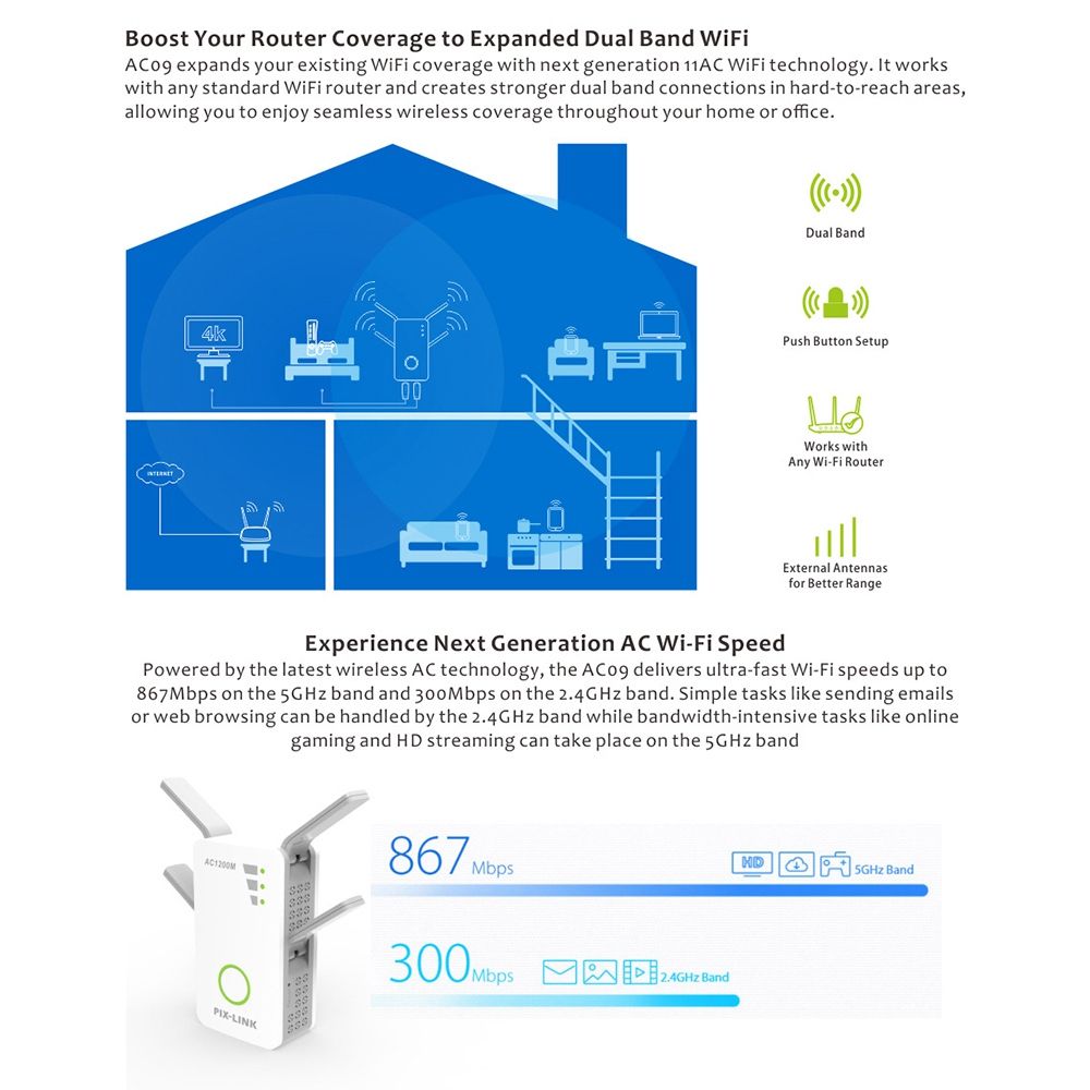 The extender can take an existing 2.4GHz or 5GHz wireless signal, repeat and extend it to a longer range where it is too far away from the router or access point toreach. Increase your wifi signal and large coverage areas,or as a router function or AP Mode