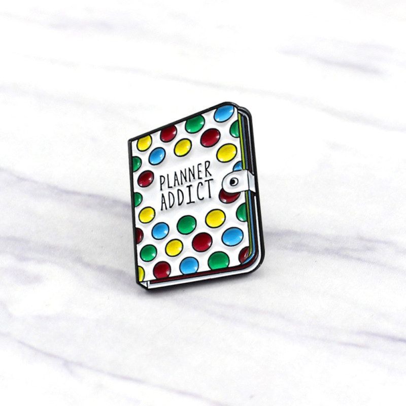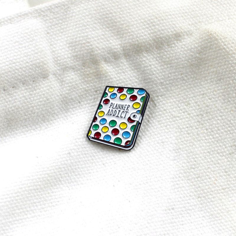 Book shaped brooch pin with "Planner Addict" letter and colorful dots pattern, cute and unique.