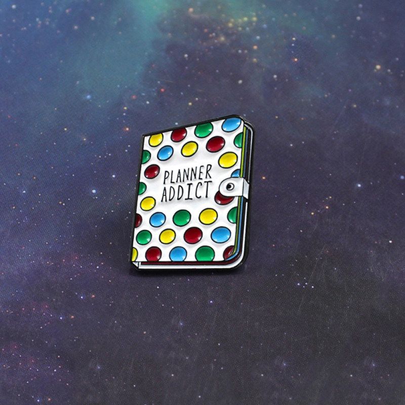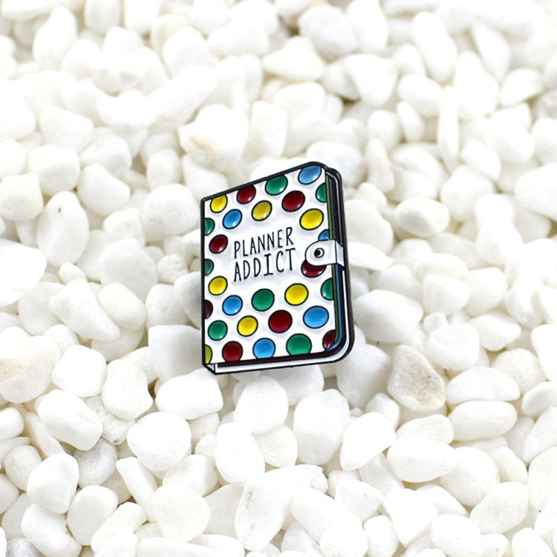 Book shaped brooch pin with ""Planner Addict"" letter and colorful dots pattern, cute and unique.
