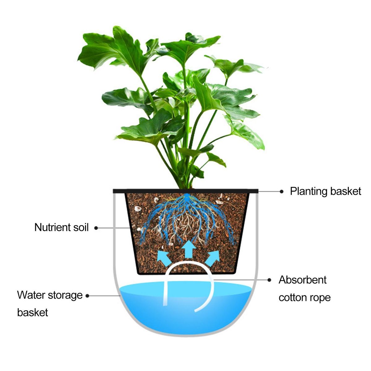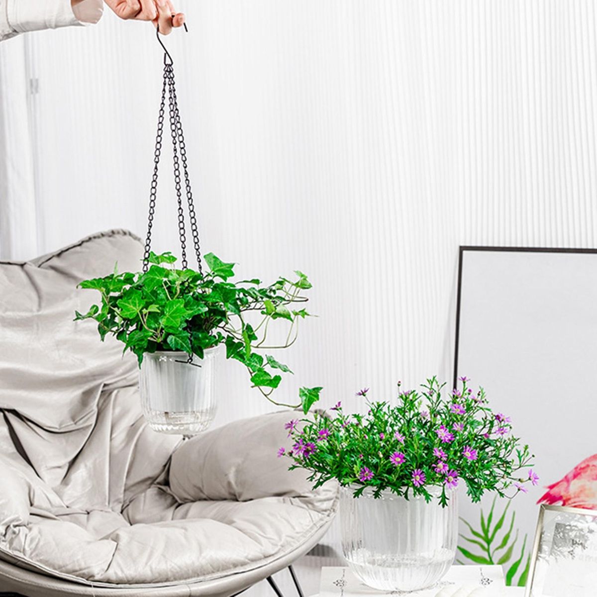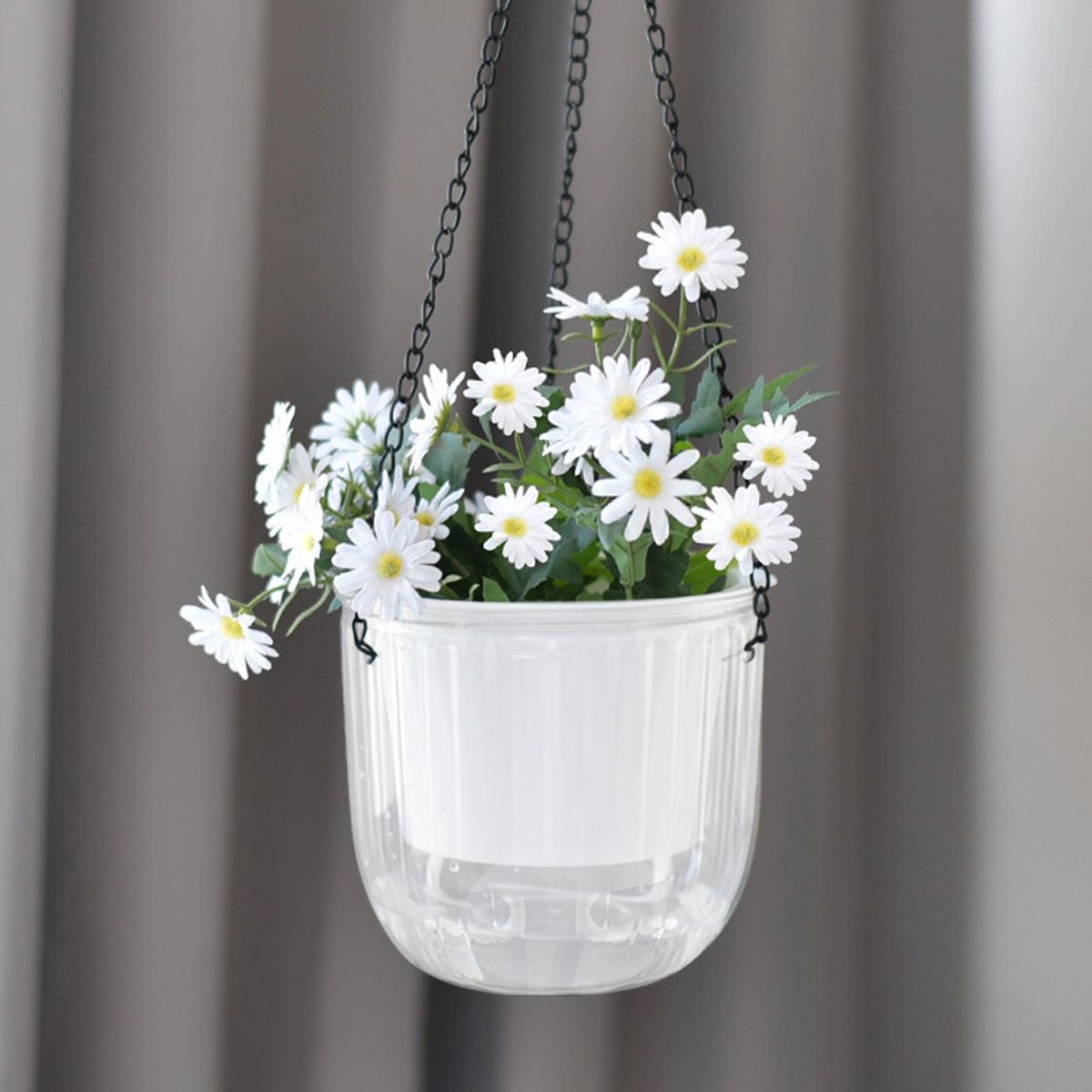 Our hanging self-watering planter comes with a long chain and cotton cord, allowing you to transfer water from the outer pot to the inner pot, retaining moisture for weeks between watering. the transparent design lets you easily monitor the water level from any angle, making it easy to maintain your plants' health.