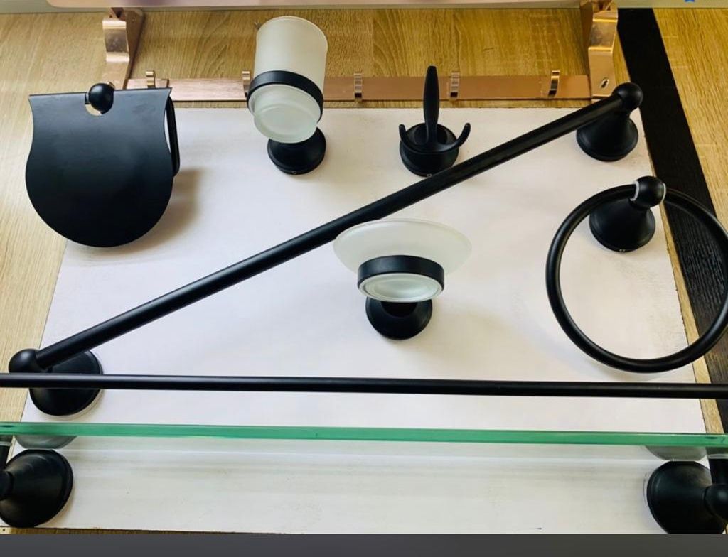 bathroom accessories; coat hook, towel rail,cup holder,tissue paper holder, soap dish and plastic shelf.. It is a complete set of 7pcs accessories needed in every modern bathroom. The superb quality and design makes it a perfect choice for your bathroom. With its anti-rust feature, its an accessories that is gonna last for a long time. Giving your bathroom that comfy and stylish look.