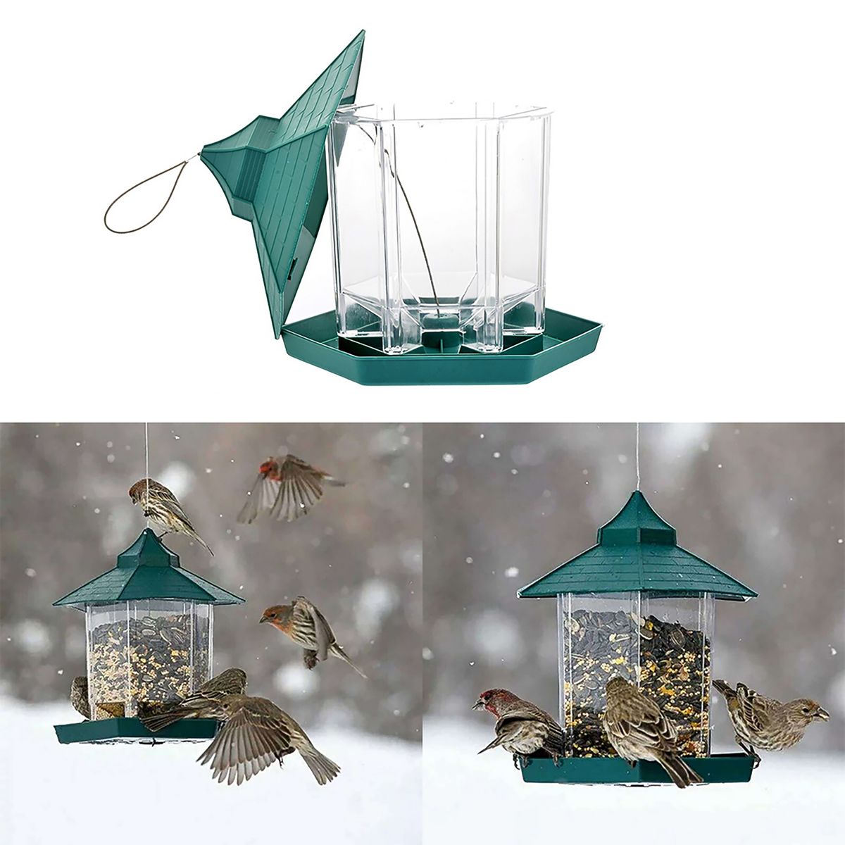 Functional and Stylish:Stylish gazebo bird feeder will provide fresh dry seed for a variety of birds. -Twist Lock:Twist lock top keeps seeds dry and away from prying squirrels. -Easy to Fill and Clean:The bird feeder can hold up to 2.25 lb of seeds, which is easy to fill, clean and use, this bird feeder will be a hit with the birds. -Waterproof:This outdoor suspension type waterproof bird feeder can reach a balanced feeding from six directions. -Convenient:The rich roof has the buckle card slot. When you opens it, it is convenient for us to add grain feed and clean it. 1* Bird Feeder