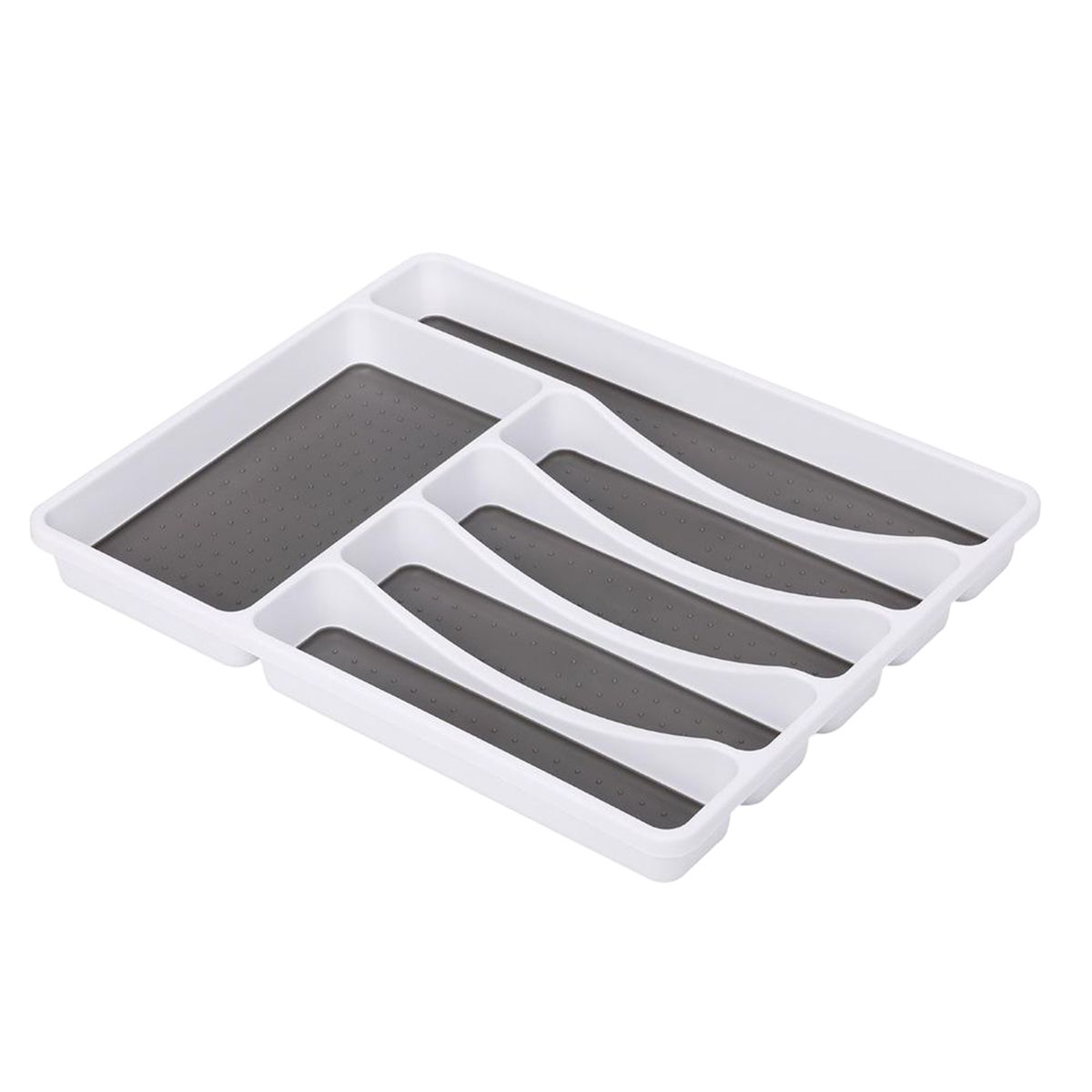 Rubber liner in each compartment keeps the cultery in place and non- rubber feet prevent the tray from sliding around in drawer.