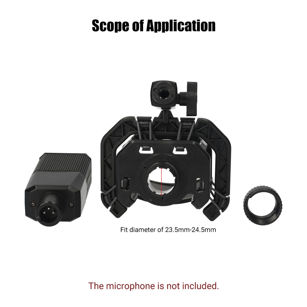 It fits diameter of 23.5mm-24.5mm, attaches to most mic boom or stand with universal screw adapter, allows angle adjusting by locking knob.