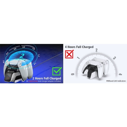 Dual Charging Station with 2 high output controller chargers can speed up charging and reduce charging time. 2 indicator lights which showing charge status, fit for PS5 Wireless Controllers. The Green light means that charging station is plugged in or fully charged. Red light means that your PS5 controller is charging.