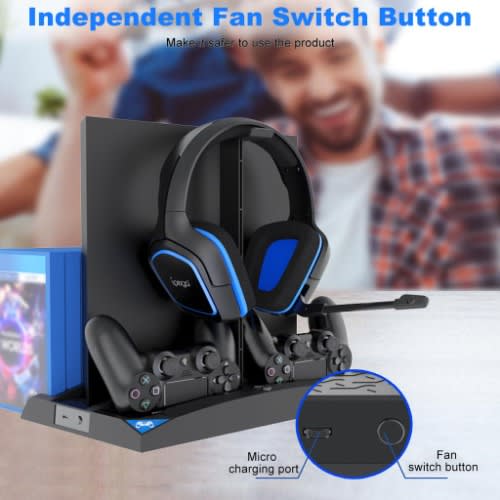 As a 6 in 1 multifunctional stand,this product can easily store PS4PS4 SlimPS4 Pro host+2As a 6 in 1 multifunctional stand,this product can easily store PS4PS4 SlimPS4 Pro host+2 controllers+headset+17 game cards simultaneously,saving a lot of space.Builtin dual cooling fans dissipate heat effectively,protecting the console from overheating. Dual port charging docks offer fast charging and realtime charging status with LEDindicators controllers+headset+17 game cards simultaneously,saving a lot of space.Builtin dual cooling fans dissipate heat effectively,protecting the console from overheating. Dual port charging docks offer fast charging and realtime charging status with LEDindicators.