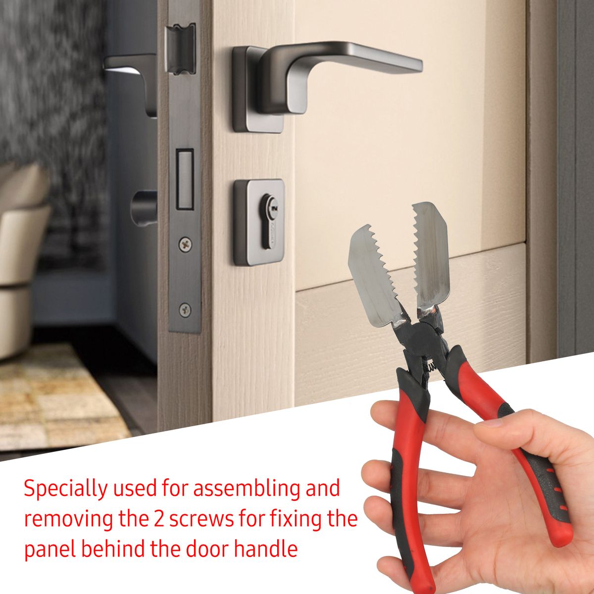 The pliers can be used for fixing and removing screws of the panel behind the door handle; it can also be used for stripping wires. A multifunction for locksmith and electrician.