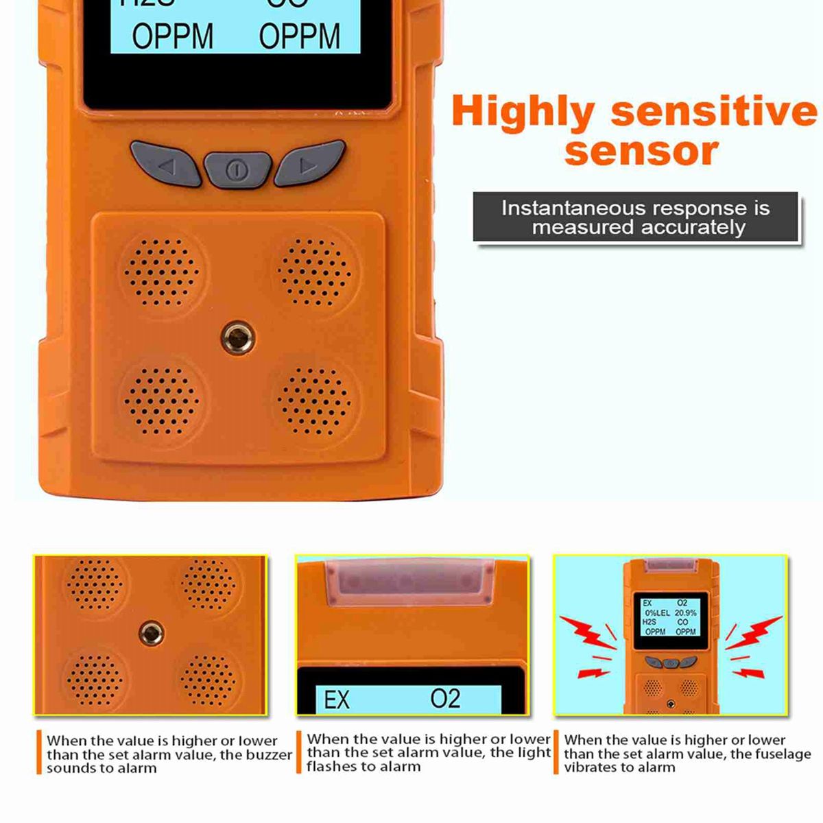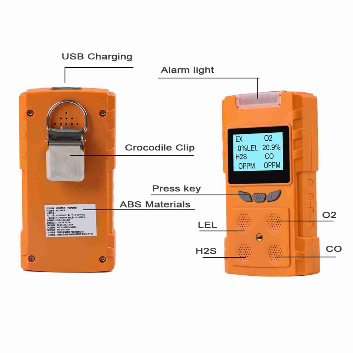 ▶Portable voice type multi gas detector is a safety device that can continuously detect the concentration of leaking gas. ▶It adopts advanced integrated circuit technology, embedded computer control, high-quality gas , with excellent sensitivity and repeatability. ▶It uses dot matrix LCD display to support Chinese-English interface and Chinese-English voice prompt, so that users can quickly understand the product and use and maintain it simply. ▶High-strength engineering plastics, good seismic resistance, high strength, high-tmospheric appearance and dust-proof, waterproof and explosion-proof function, etc. ▶The detector is widely used in petroleum, industry, envmental protection, metallurgy, refining, gas, bio medicine, agriculture, fire protection, Archaeology and other industries and places that need safety monitoring for toxicity and harmfulne, explosion prevention. The detector can effectively predict the concentration of dangerous gases and alarm, so as to ensure the safety of workers and production equipment. Technical parameter: Gas type: EX, H2S, CO, O2 EX Range: (0-100)%LEL; Low alarm: 20%LEL; High: 50%LEL; Resolutio: 1%LEL H2S Range: (0-100)ppm; Low alarm: 10ppm; High: 35ppm; Resolutio: 1ppm CO Range: (0-1000)ppm; Low alarm: 50ppm; High: 150ppm; Resolutio: 1ppm O2 Range: (0-30)%vol; Low alarm: 19.5%vol; High: 23.5%vol; Resolutio: 0.1%vol Precision: ≤±5%FS Response time: T