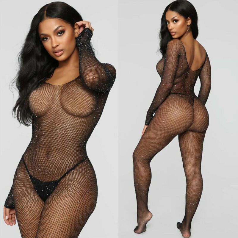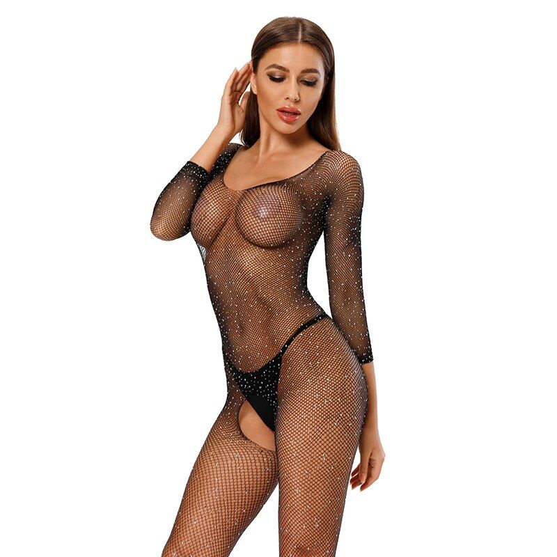1X Plus Size Erotic Sexy Lingerie Bling Rhinestone Fishnet Bodysuit Transparent Dress Women Mesh Tights Sexy Exotic Body Socks
