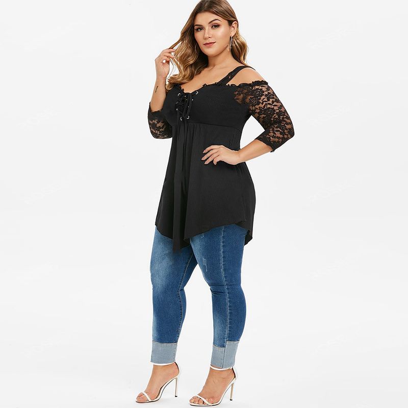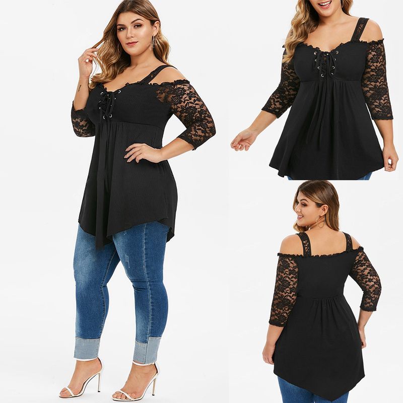 1X Plus Size Lace Off Shoulder Tops Hollow Out Shirt Black Tee Shirt Ladies Casual T-shirt Solid Color Midi Sleeve Tops