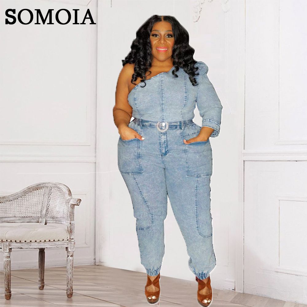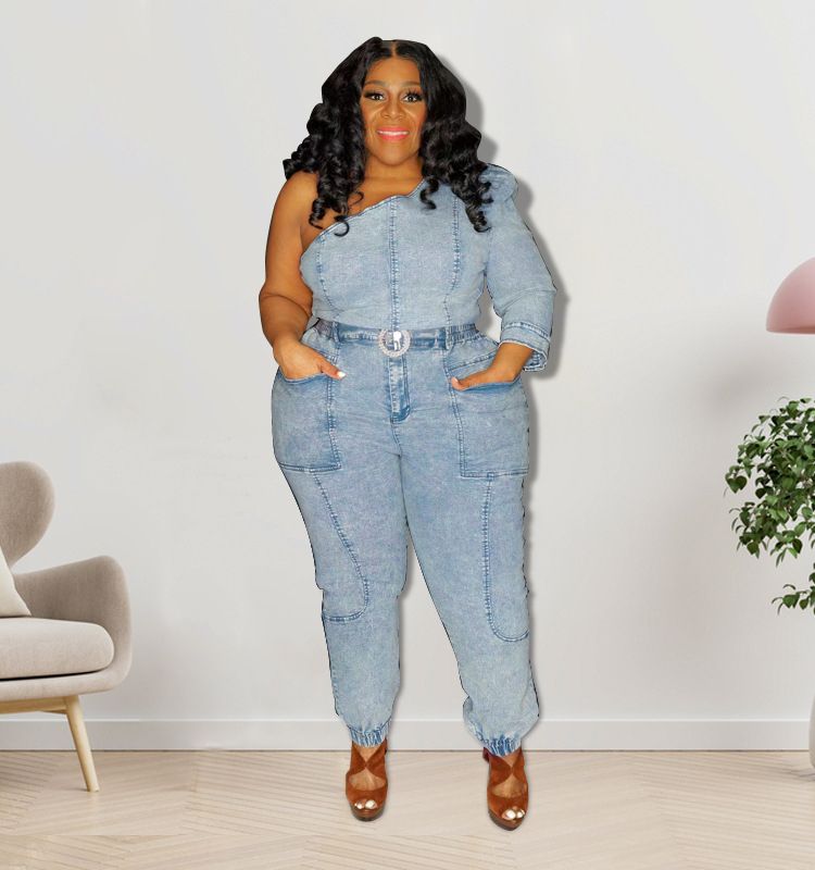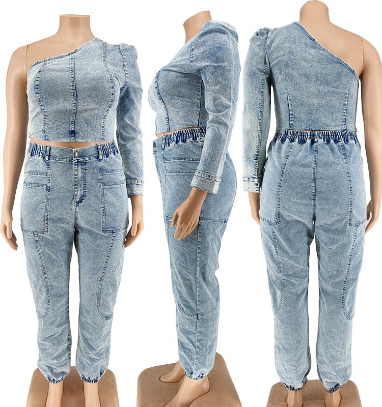 1X Plus Size Women Clothing y Slanted Shoulder Stitching Cutout Top Slim Pants Denim Style Evening Party Wholesale Dropshipping