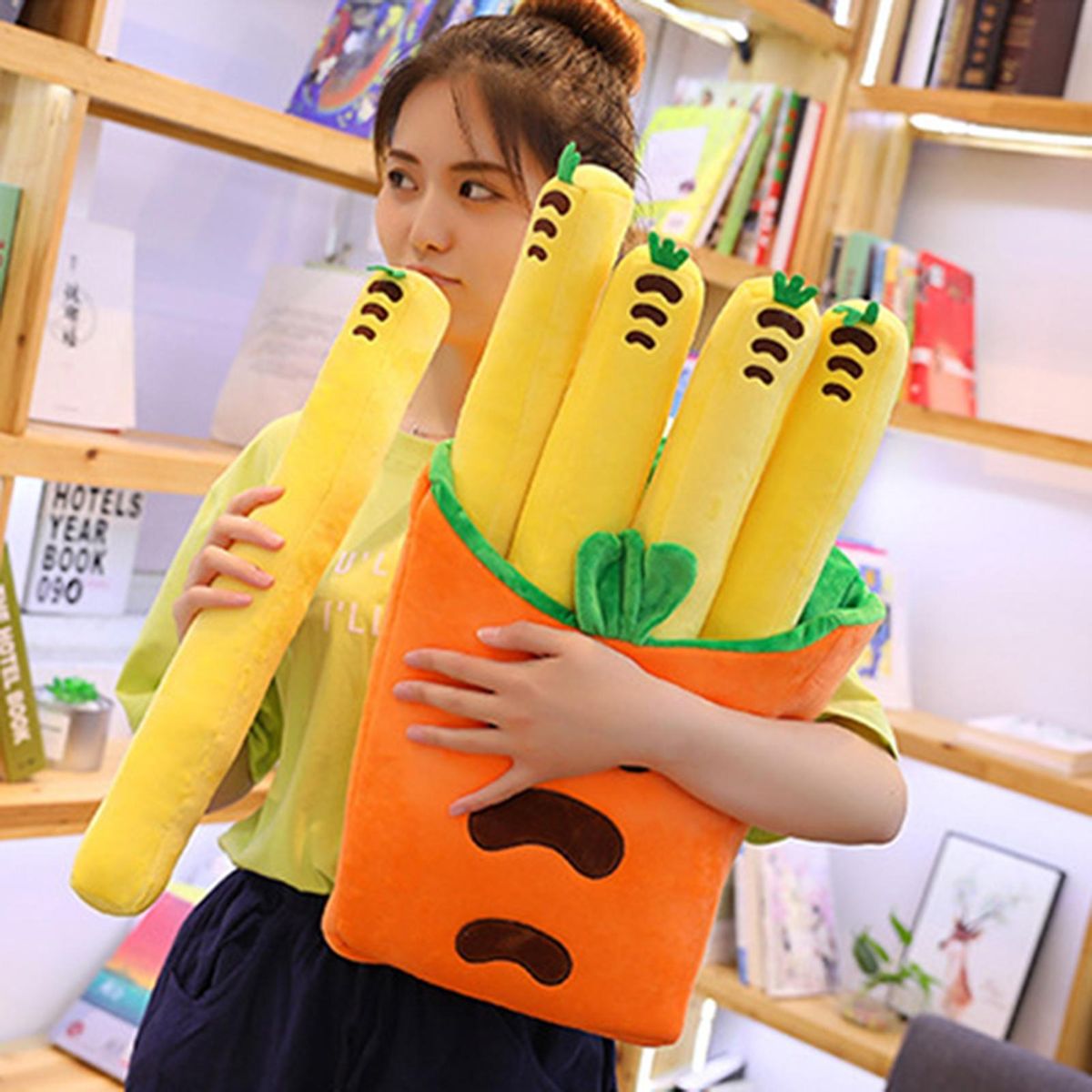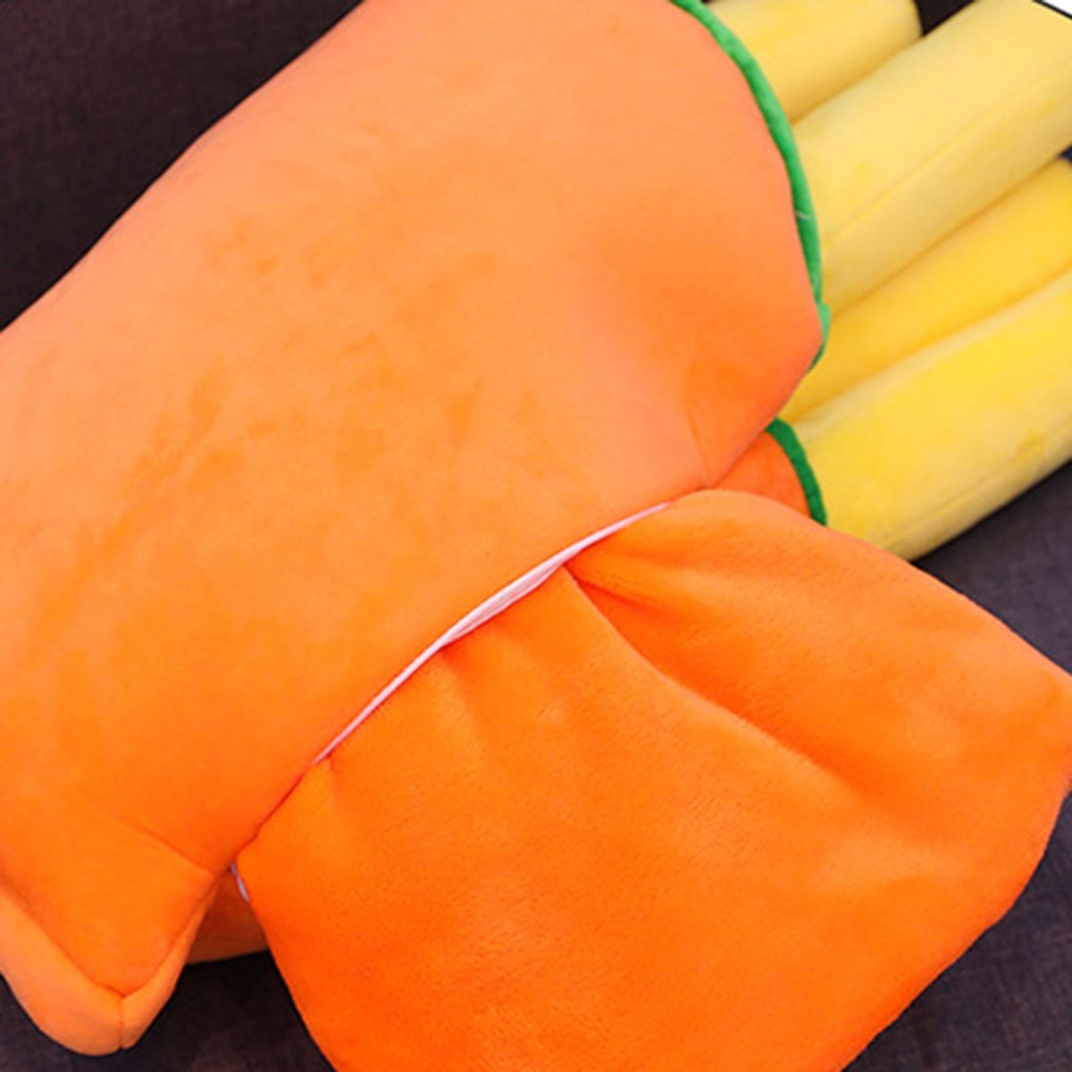 A cute plush toy, and is also a plush pillow included 5 fries. Because of the plush fabric, the touch is softer than ordinary pillows. Watch TV, read a book, sleep when you can lean on or hug it, or sit down to play computer when you can use it as a cushion.