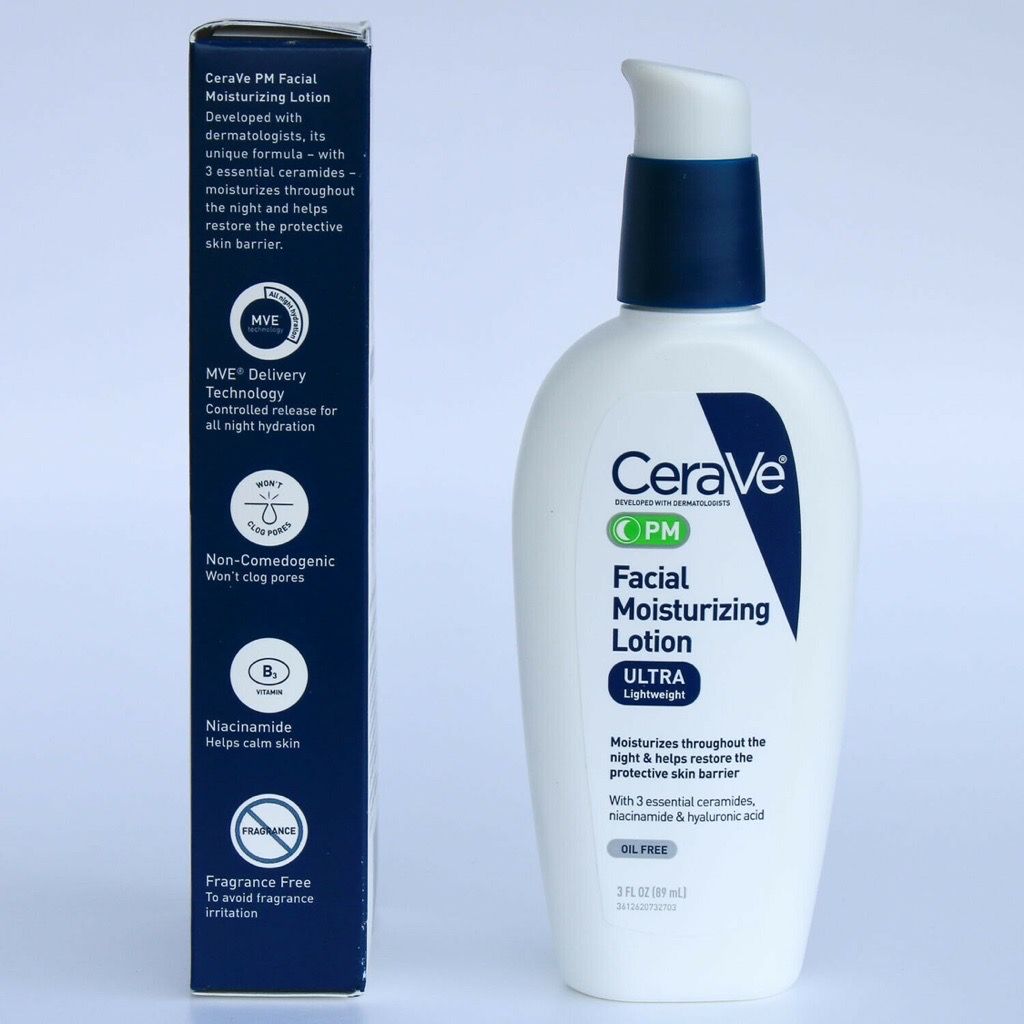 Cerave pm facial moisturizing lotion is formulated to lock in your skin's moisture and help restore your skin's natural barrier, all while you sleep. Adding this oil-free, non-comedogenic night cream to your night time skincare routine can help hydrate, calm, and soothe your skin, while also helping to maintain your protective skin barrier. It contains Niacinamide, hyaluronic acid, and three essential ceramides, this night cream uses our MVE Technology to deliver a steady stream of much-needed moisture throughout the night, and offers an effective, yet gentle way to care for your normal to oily skin.