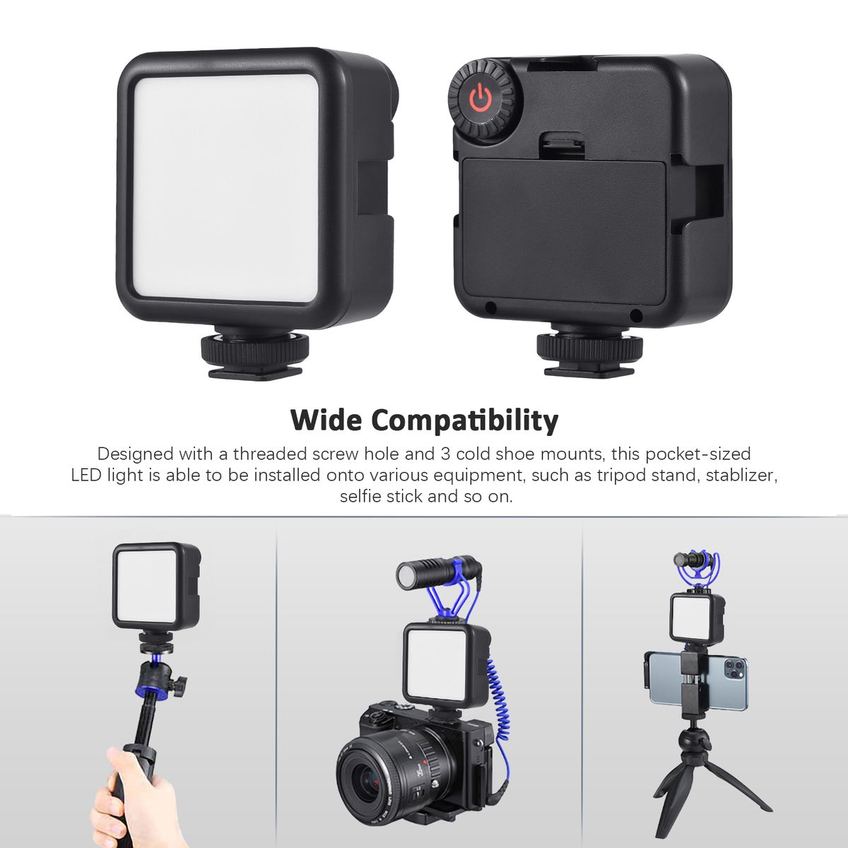【Wide Compatibility】Designed with a threaded screw hole and 3 cold shoe mounts, this pocket-sized LED light is able to be installed onto various equipment, such as tripod stand, stablizer, selfie stick and so on.
